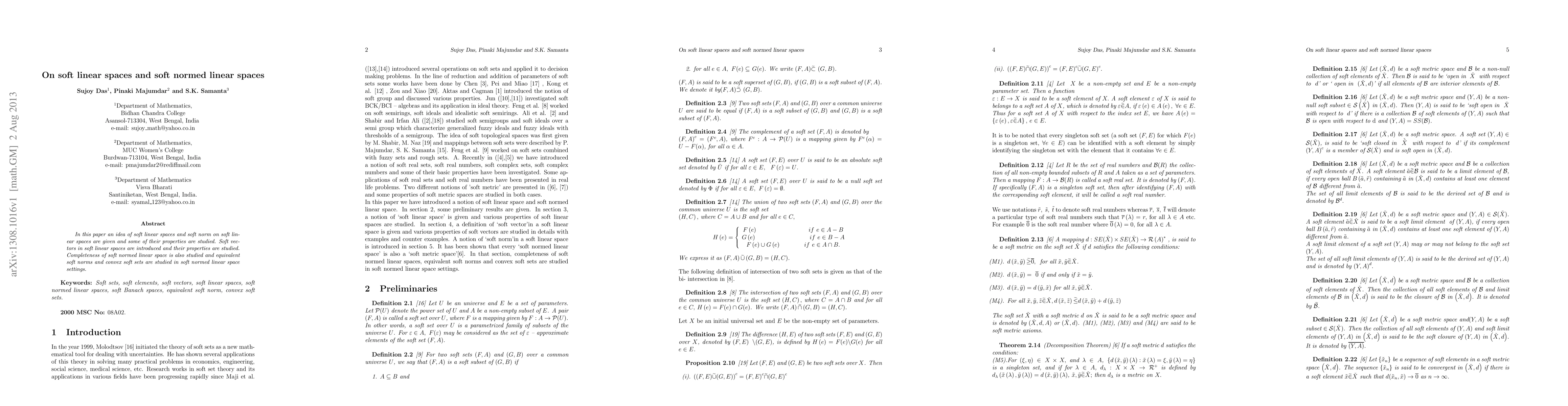 This paper introduces the concept of soft linear spaces and soft normed linear spaces, studying their properties, including completeness, equivalent soft norms, and convex soft sets. It also explores soft vectors within these spaces.