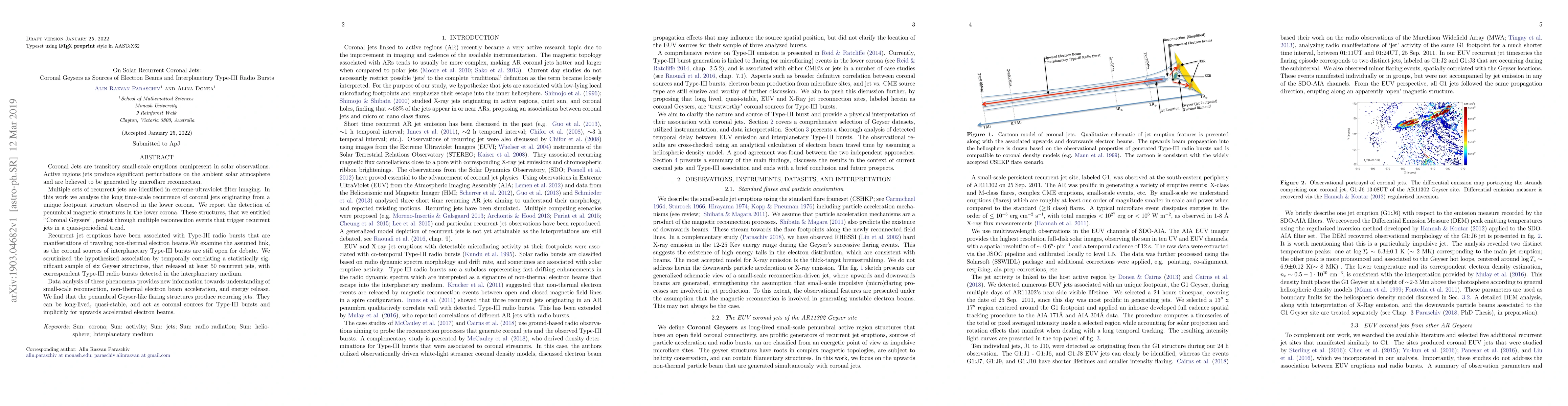 This paper investigates recurrent coronal jets, termed "Coronal Geysers," originating from stable penumbral structures in the lower corona, and their association with Type-III radio bursts. The study finds that these Geysers trigger quasi-periodic jet eruptions and are likely sources of non-thermal electron beams and interplanetary Type-III bursts.