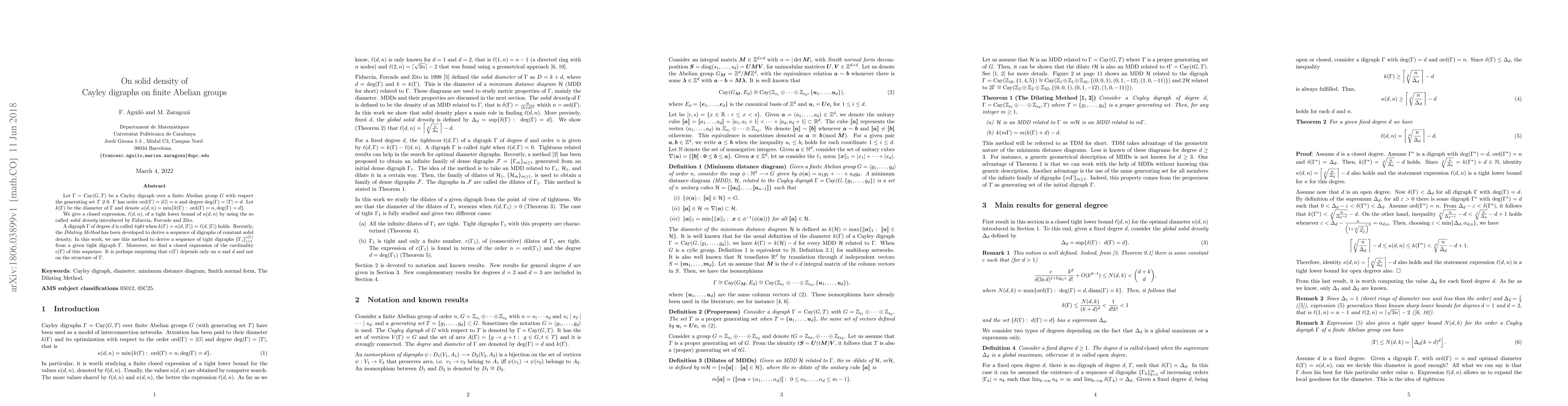 Let $\Gamma=$Cay$(G,T)$ be a Cayley digraph over a finite Abelian group $G$ with respect the generating set $T\not\ni0$. $\Gamma$ has order ord$(\Gamma)=|G|=n$ and degree deg$(\Gamma)=|T|=d$. Let $k(\Gamma)$ be the diameter of $\Gamma$ and denote $\kappa(d,n)=\min\{k(\Gamma):~\textrm{ord}(\Gamma)=n,\textrm{deg}(\Gamma)=d\}$. We give a closed expression, $\ell(d,n)$, of a tight lower bound of $\kappa(d,n)$ by using the so called {\em solid density} introduced by Fiduccia, Forcade and Zito. A digraph $\Gamma$ of degree $d$ is called {\em tight} when $k(\Gamma)=\kappa(d,|\Gamma|)=\ell(d,|\Gamma|)$ holds. Recently, the {\em Dilating Method} has been developed to derive a sequence of digraphs of constant solid density. In this work, we use this method to derive a sequence of tight digraphs $\{\Gamma_i\}_{i=1}^{\textrm{c}(\Gamma)}$ from a given tight digraph $\Gamma$. Moreover, we find a closed expression of the cardinality c$(\Gamma)$ of this sequence. It is perhaps surprising that c$(\Gamma)$ depends only on $n$ and $d$ and not on the structure of $\Gamma$.