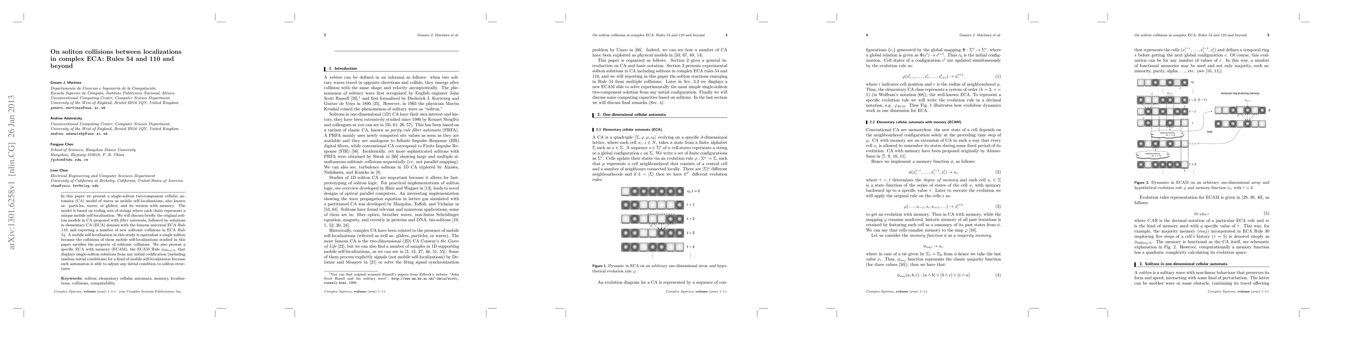 This paper introduces a single-soliton model for cellular automata (CA) based on elementary CA rules, particularly focusing on Rule 54 and Rule 110, and explores solitonic collisions within these systems. It also presents a memory-enhanced CA model, ECAM Rule $\phi_{R9maj:4}$, capable of generating soliton solutions from any initial condition.