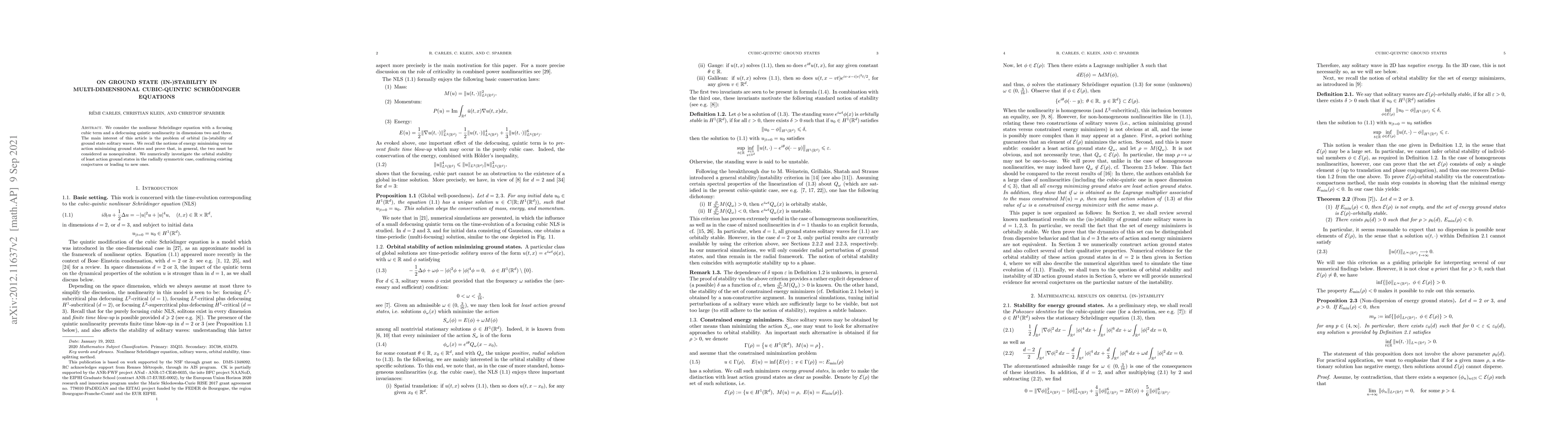 This paper examines the stability of solitary waves in two- and three-dimensional cubic-quintic nonlinear Schrödinger equations. It distinguishes between two types of orbital stability and numerically investigates the stability of ground states in radially symmetric cases, validating existing conjectures and proposing new ones.