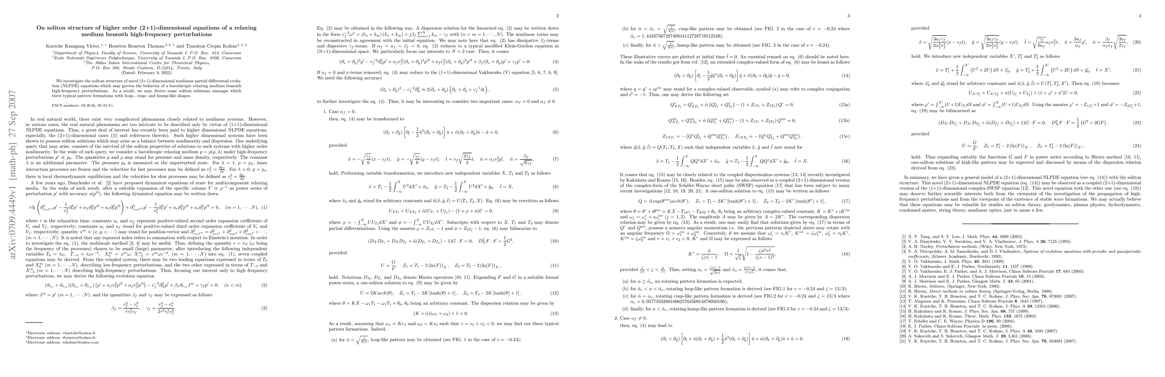 We investigate the soliton structure of novel (2+1)-dimensional nonlinear partial differential evolution(NLPDE) equations which may govern the behavior of a barothropic relaxing medium beneath high-frequency perturbations. As a result, we may derive some soliton solutions amongst which three typical pattern formations with loop-, cusp- and hump-like shapes.