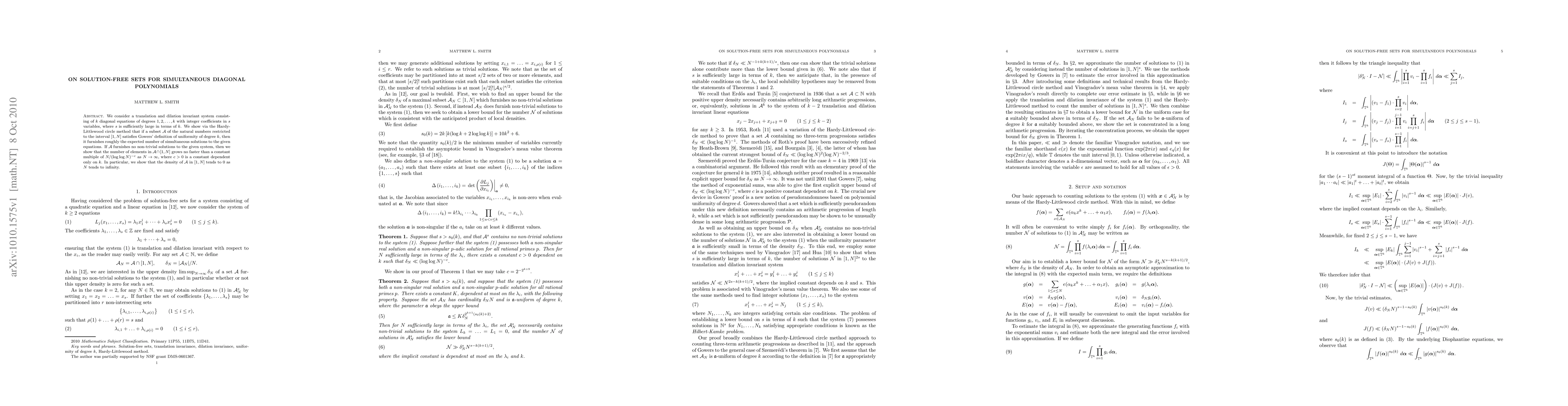 The paper uses the Hardy-Littlewood circle method to study the number of simultaneous solutions to a system of diagonal equations with integer coefficients. It shows that if a subset A satisfies certain conditions, it furnishes roughly the expected number of solutions, but if not, its density in [1,N] tends to 0 as N grows to infinity.