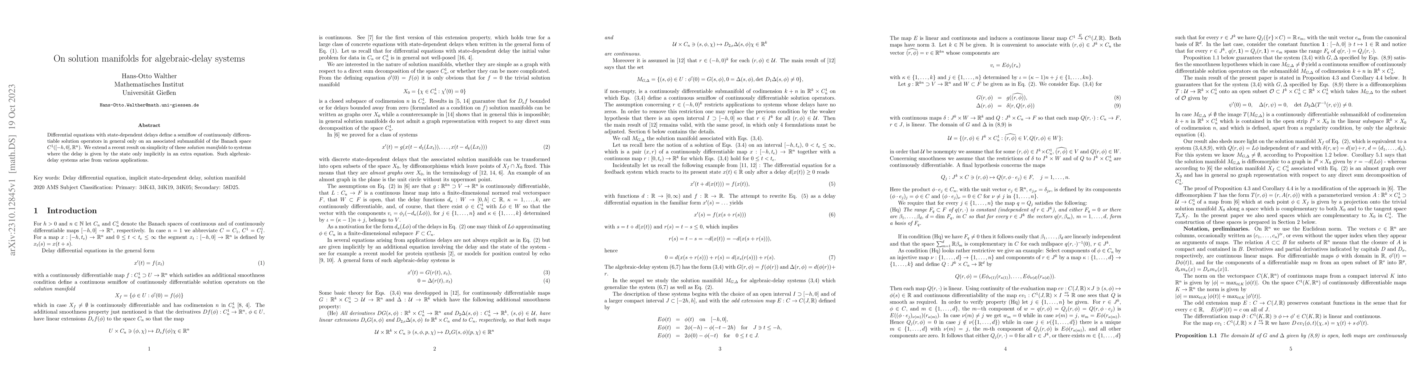 This paper extends the simplicity of solution manifolds for algebraic-delay systems, where delays are implicitly defined, to a broader class of continuously differentiable solution operators in Banach space. Such systems emerge in various practical applications.
