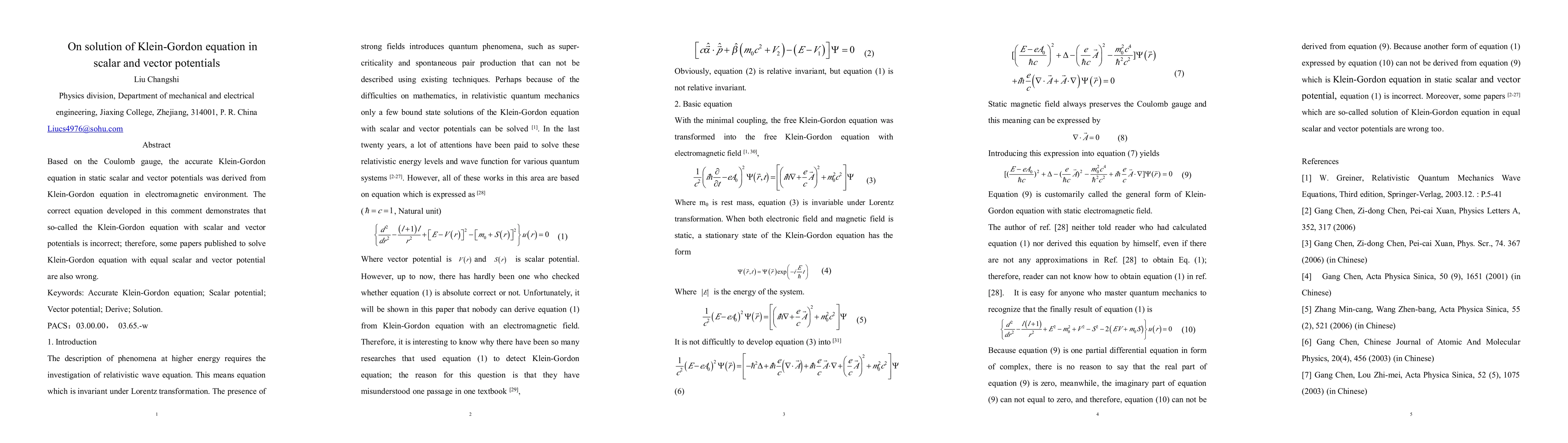 Based on the Coulomb gauge, the accurate Klein-Gordon equation in static scalar and vector potentials was derived from Klein-Gordon equation in electromagnetic environment. The correct equation developed in this comment demonstrates that so-called the Klein-Gordon equation with scalar and vector potentials is incorrect; therefore, some papers published to solve Klein-Gordon equation with equal scalar and vector potential are also wrong.