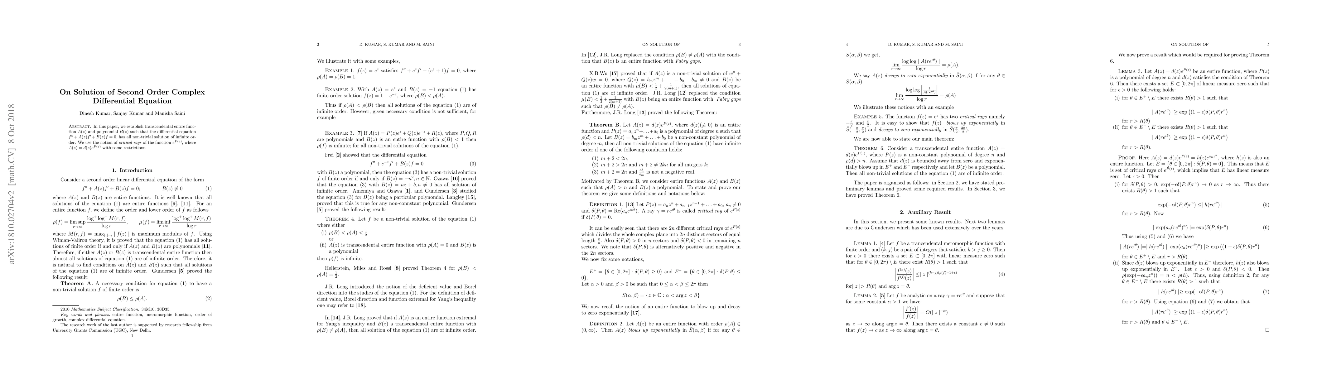 In this paper, we establish transcendental entire function $A(z)$ and polynomial $B(z)$ such that the differential equation $f''+A(z)f'+B(z)f=0$, has all non-trivial solution of infinite order. We use the notion of \emph{critical rays} of the function $e^{P(z)}$, where $A(z)=d(z)e^{P(z)}$ with some restrictions.