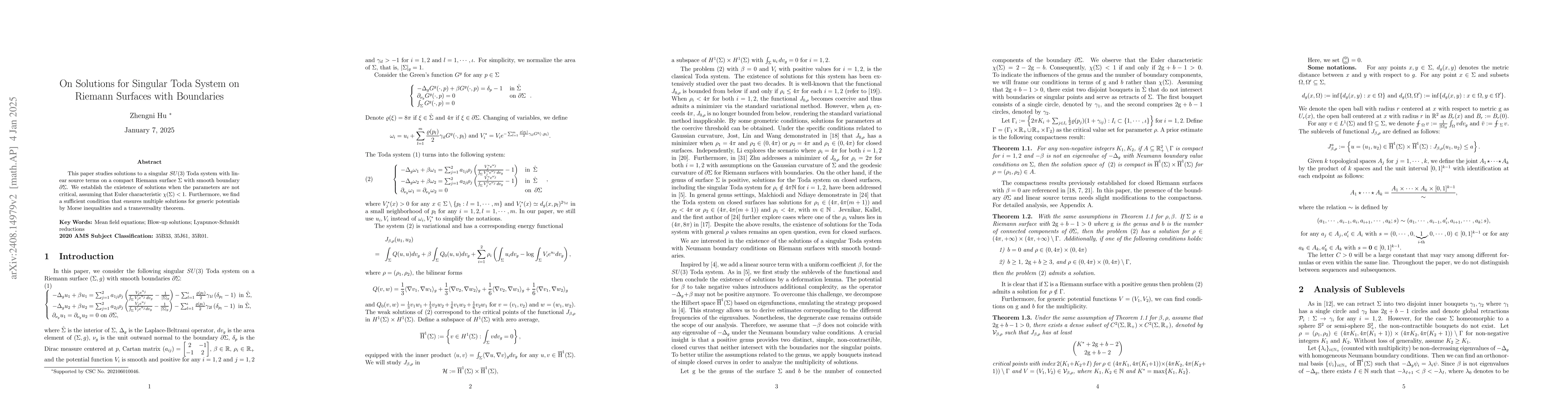 This paper studies solutions to a singular $SU(3)$ Toda system with linear source terms on a compact Riemann surface $\Sigma$ with smooth boundaries $\partial\Sigma$. We establish the existence of solutions when the parameters are not critical, assuming that Euler characteristic $\chi(\Sigma)<1$ via analyzing the sublevels. Furthermore, we find a sufficient condition that ensures multiple solutions for generic potentials by Morse inequalities and a transversality theorem.