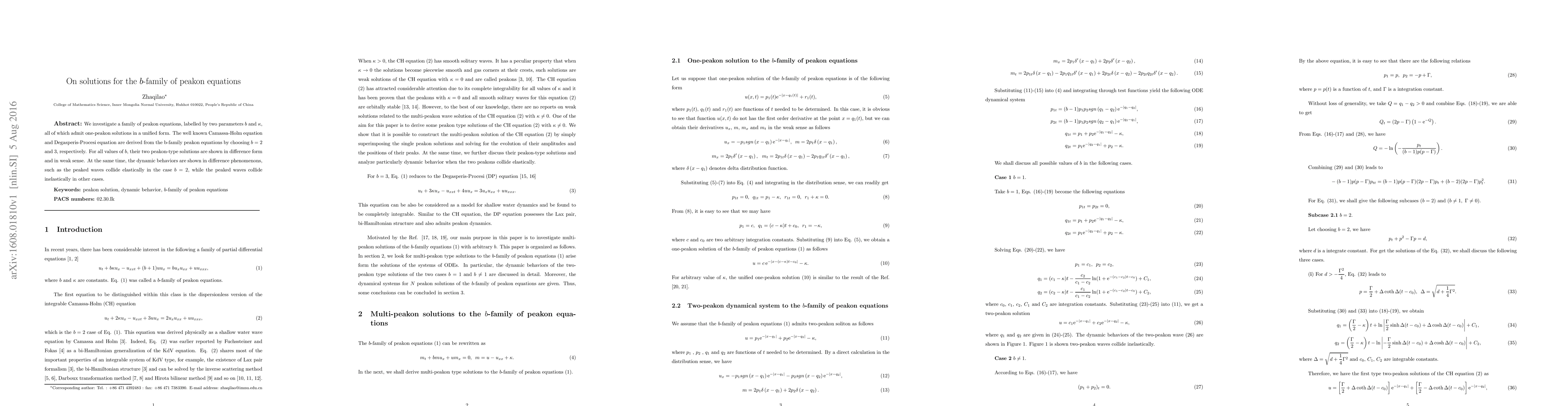 This paper explores a family of peakon equations parameterized by $b$ and $\kappa$, deriving well-known equations like the Camassa-Holm and Degasperis-Procesi by specific $b$ values. It reveals distinct dynamic behaviors, such as elastic collisions for $b=2$ and inelastic collisions for other $b$ values.