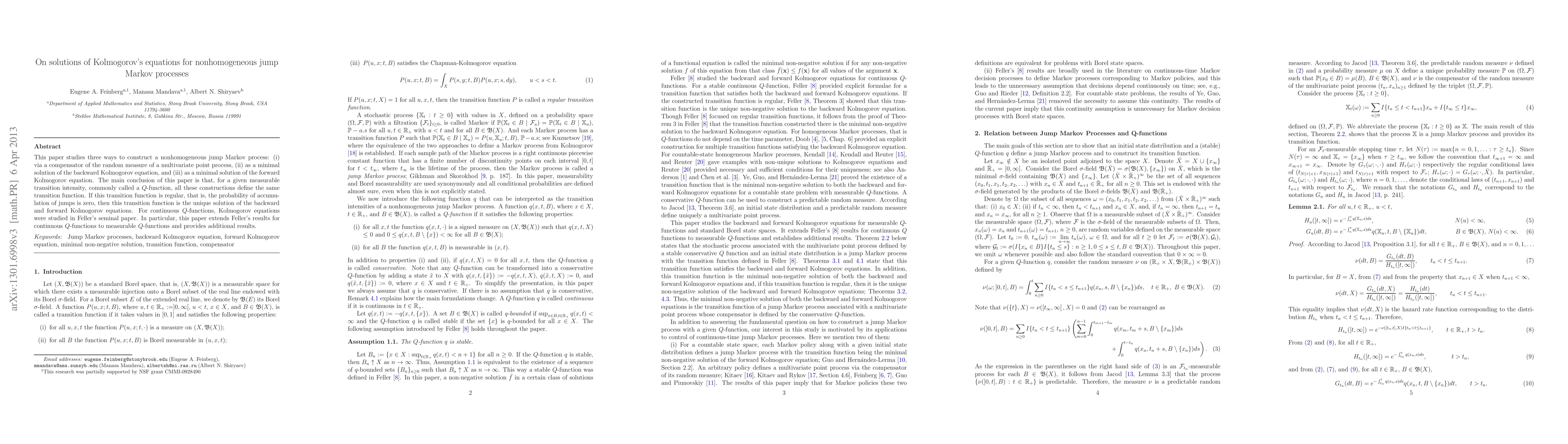This paper studies three ways to construct a nonhomogeneous jump Markov process: (i) via a compensator of the random measure of a multivariate point process, (ii) as a minimal solution of the backward Kolmogorov equation, and (iii) as a minimal solution of the forward Kolmogorov equation. The main conclusion of this paper is that, for a given measurable transition intensity, commonly called a Q-function, all these constructions define the same transition function. If this transition function is regular, that is, the probability of accumulation of jumps is zero, then this transition function is the unique solution of the backward and forward Kolmogorov equations. For continuous Q-functions, Kolmogorov equations were studied in Feller's seminal paper. In particular, this paper extends Feller's results for continuous Q-functions to measurable Q-functions and provides additional results.