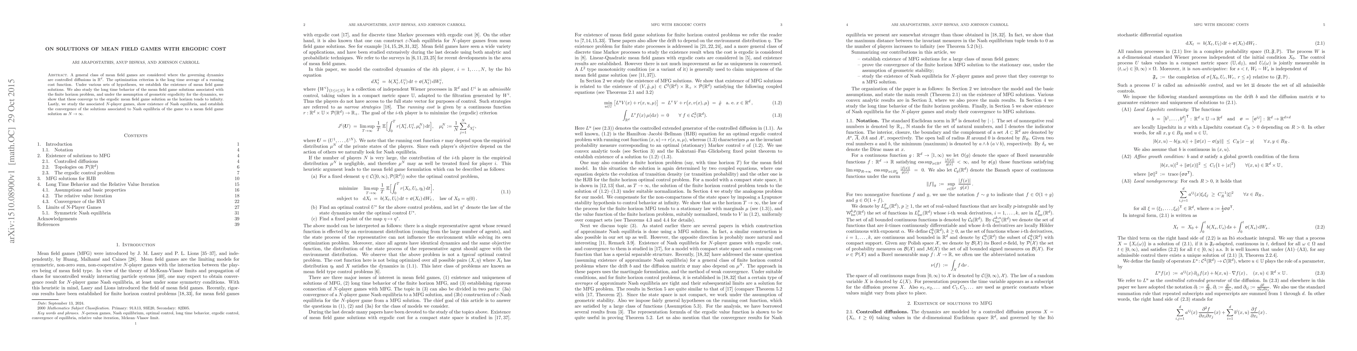 This paper explores mean field games governed by controlled diffusions, proving the existence of solutions under various hypotheses. It further investigates the long-term behavior of solutions, showing convergence to an ergodic mean field game solution under geometric ergodicity, and examines the transition from $N$-player Nash equilibria to mean field game solutions as $N$ approaches infinity.