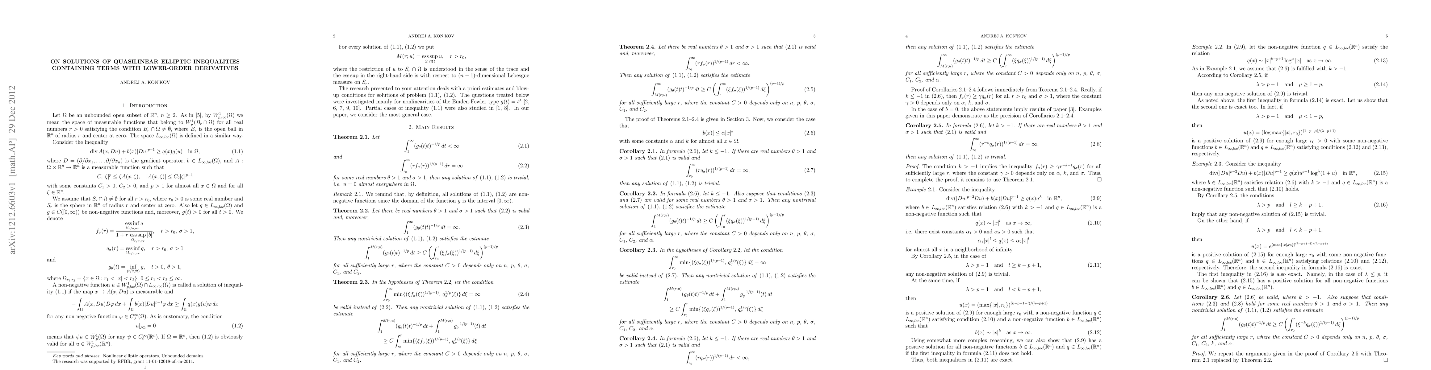 Summary: This paper provides estimates and blow-up conditions for solutions of quasilinear elliptic inequalities that include terms with lower-order derivatives, contributing to the understanding of their behavior and properties.
