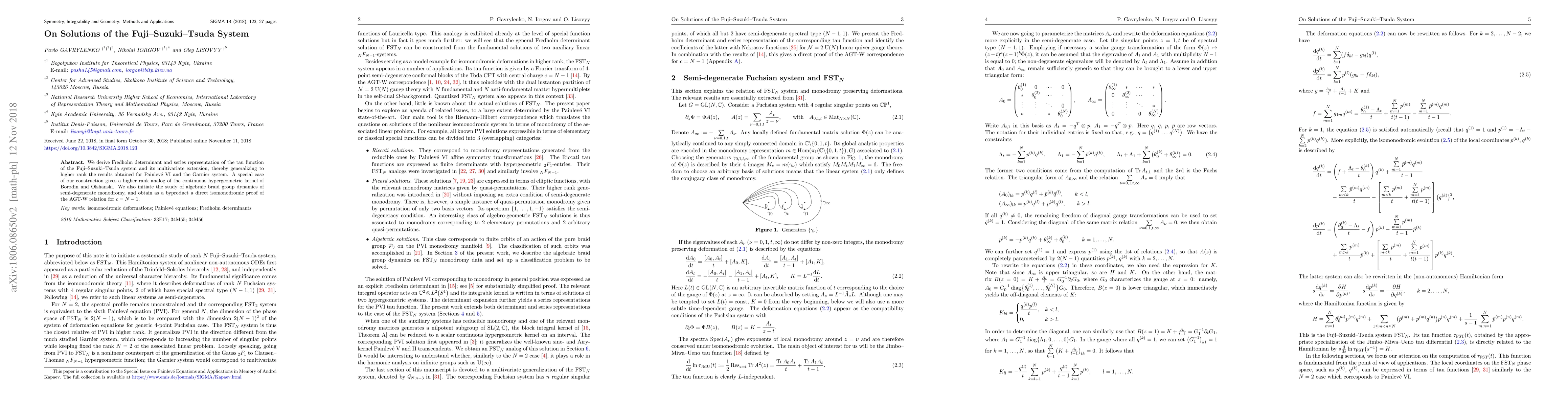 We derive Fredholm determinant and series representation of the tau function of the Fuji-Suzuki-Tsuda system and its multivariate extension, thereby generalizing to higher rank the results obtained for Painlev\'e VI and the Garnier system. A special case of our construction gives a higher rank analog of the continuous hypergeometric kernel of Borodin and Olshanski. We also initiate the study of algebraic braid group dynamics of semi-degenerate monodromy, and obtain as a byproduct a direct isomonodromic proof of the AGT-W relation for $c=N-1$.