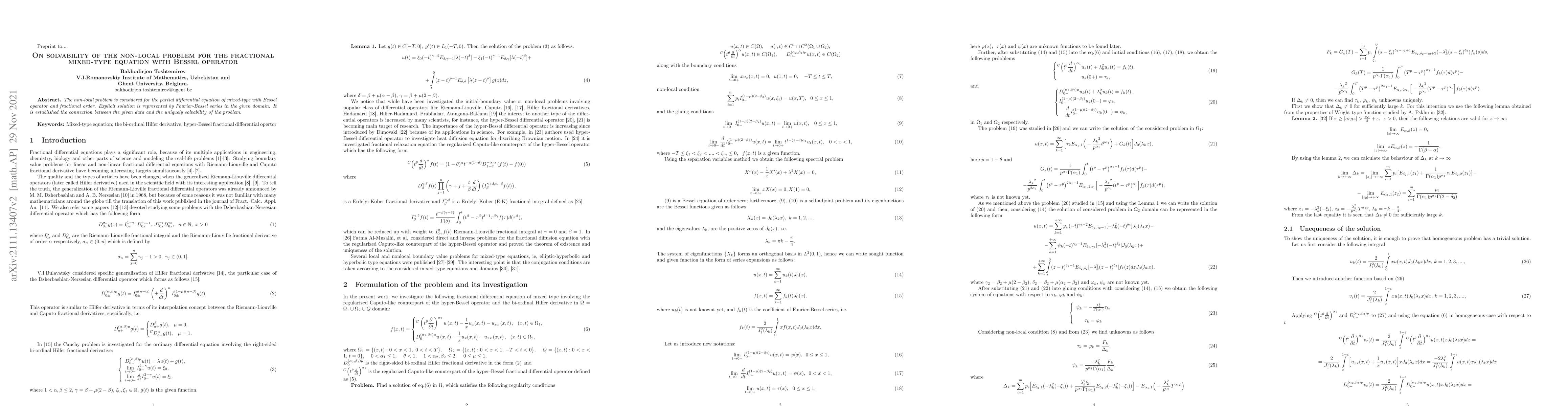 This paper investigates the solvability of a non-local problem for a fractional mixed-type partial differential equation involving a Bessel operator. An explicit solution is derived using Fourier-Bessel series, establishing a connection between the problem's data and its unique solvability.