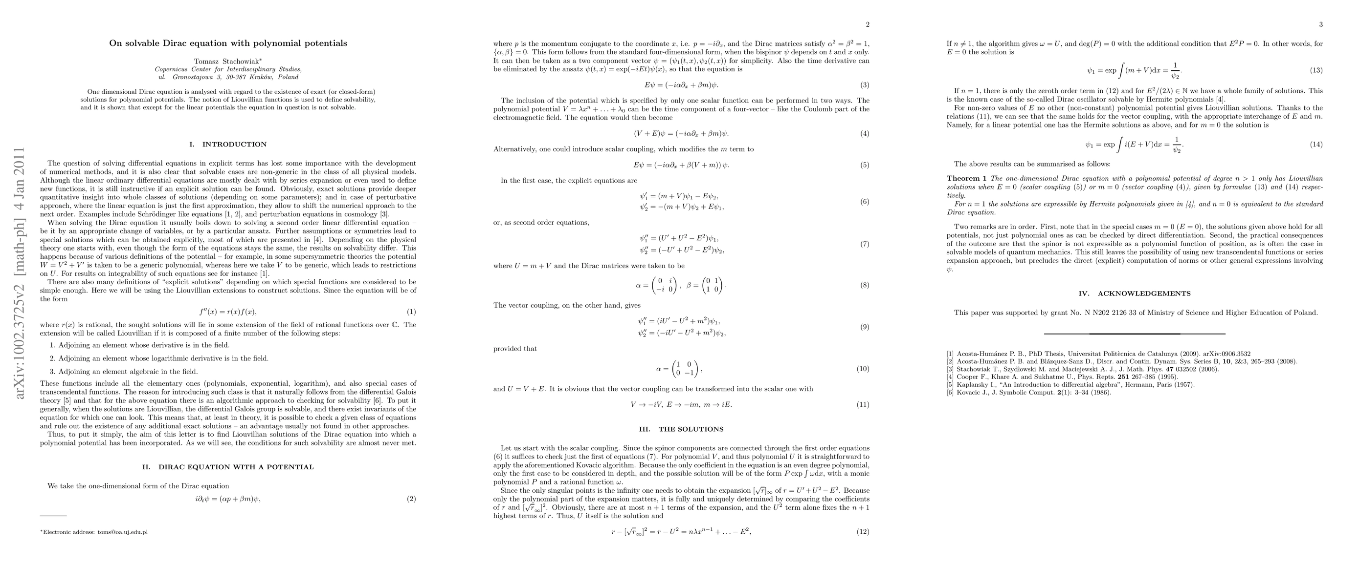 This paper investigates the existence of exact solutions for the one-dimensional Dirac equation with polynomial potentials, finding that only linear potentials yield solvable cases using Liouvillian functions. Non-linear polynomial potentials do not support closed-form solutions.