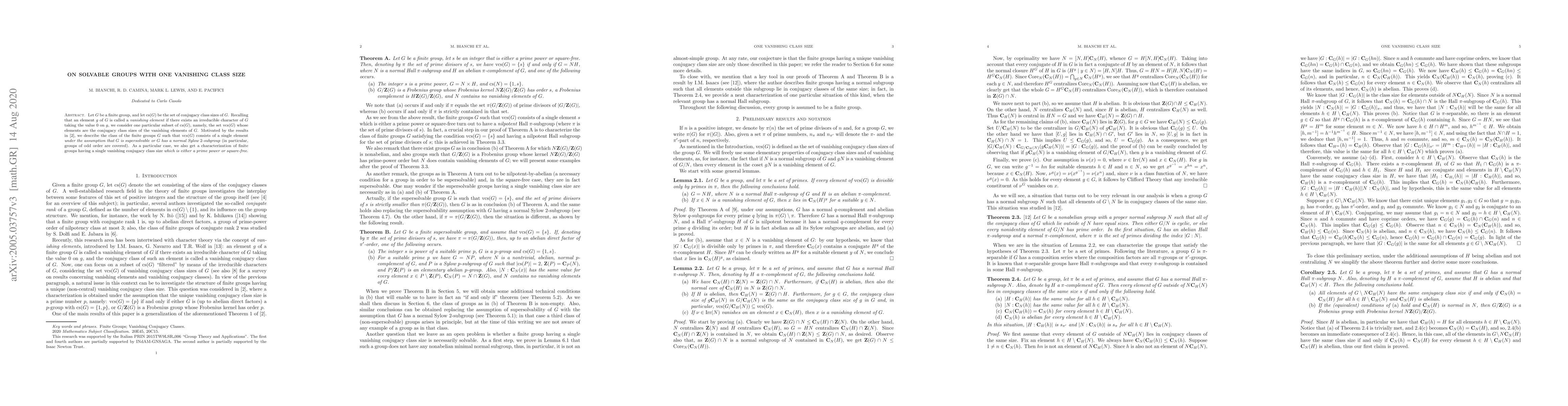 Let $G$ be a finite group, and let cs$(G)$ be the set of conjugacy class sizes of $G$. Recalling that an element $g$ of $G$ is called a \emph{vanishing element} if there exists an irreducible character of $G$ taking the value $0$ on $g$, we consider one particular subset of cs$(G)$, namely, the set vcs$(G)$ whose elements are the conjugacy class sizes of the vanishing elements of $G$. Motivated by the results in \cite{BLP}, we describe the class of the finite groups $G$ such that vcs$(G)$ consists of a single element \emph{under the assumption that $G$ is supersolvable or $G$ has a normal Sylow $2$-subgroup} (in particular, groups of odd order are covered). As a particular case, we also get a characterization of finite groups having a single vanishing conjugacy class size \emph{which is either a prime power or square-free}.