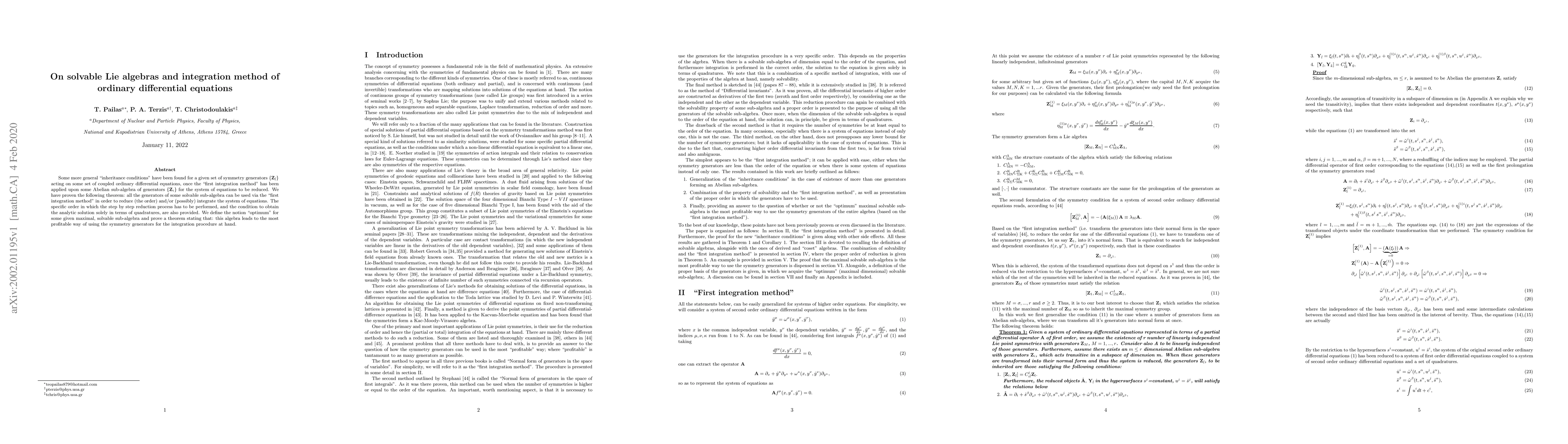 Some more general "inheritance conditions" have been found for a given set of symmetry generators $\{\mathbf{Z}_{\bar{l}}\}$ acting on some set of coupled ordinary differential equations, once the "first integration method" has been applied upon some Abelian sub-algebra of generators $\{\mathbf{Z}_{i}\}$ for the system of equations to be reduced. We have proven the following theorem: all the generators of some solvable sub-algebra can be used via the "first integration method" in order to reduce (the order) and/or (possibly) integrate the system of equations. The specific order in which the step by step reduction process has to be performed, and the condition to obtain the analytic solution solely in terms of quadratures, are also provided. We define the notion "optimum" for some given maximal, solvable sub-algebra and prove a theorem stating that: this algebra leads to the most profitable way of using the symmetry generators for the integration procedure at hand.