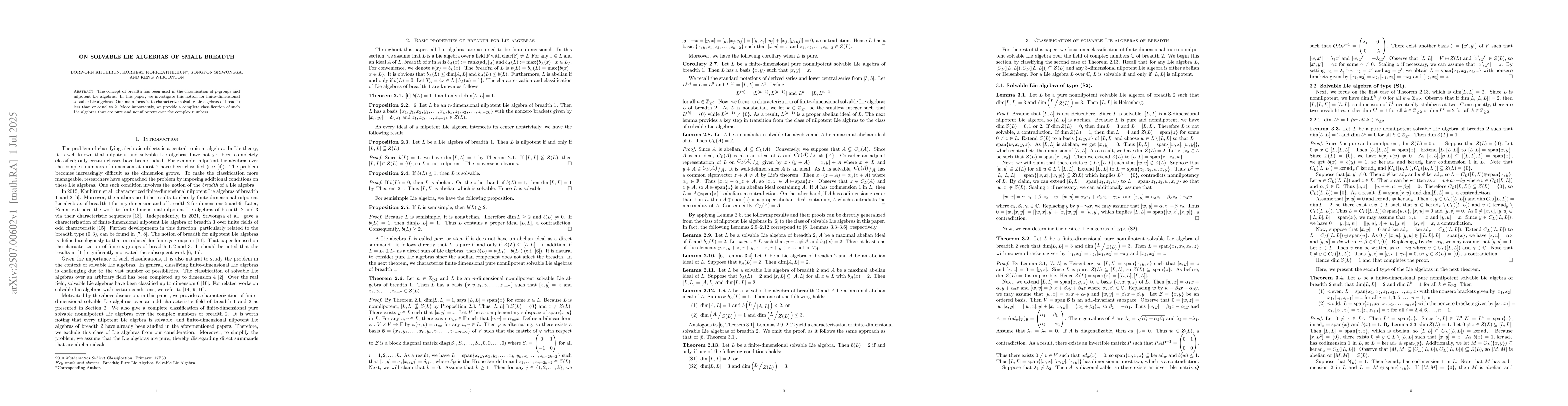 The concept of breadth has been used in the classification of p-groups and nilpotent Lie algebras. In this paper, we investigate this notion for finite-dimensional solvable Lie algebras. Our main focus is to characterize solvable Lie algebras of breadth less than or equal to 2. More importantly, we provide a complete classification of such Lie algebras that are pure and nonnilpotent over the complex numbers.