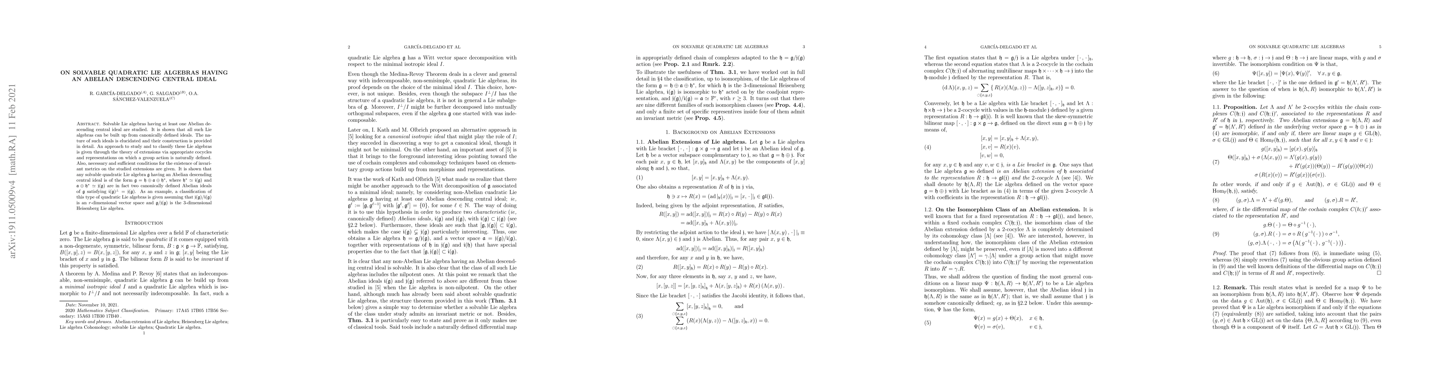 Summary: This paper explores solvable quadratic Lie algebras with an Abelian descending central ideal, showing that they can be constructed from canonically defined ideals. It provides an approach to classify these Lie algebras through extensions and conditions for invariant metrics, and classifies a specific type assuming certain structural dimensions.