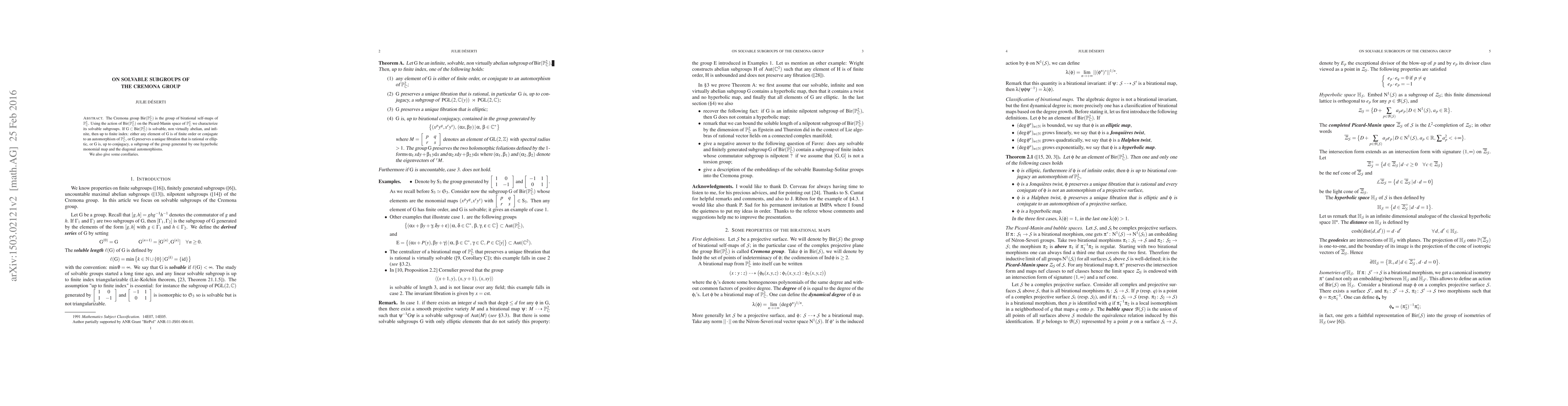 This paper characterizes solvable subgroups of the Cremona group, showing that if a subgroup is solvable, non-abelian, and infinite, it either consists of elements of finite order, preserves a unique rational or elliptic fibration, or is generated by a hyperbolic monomial map and diagonal automorphisms. It also discusses several corollaries arising from these findings.