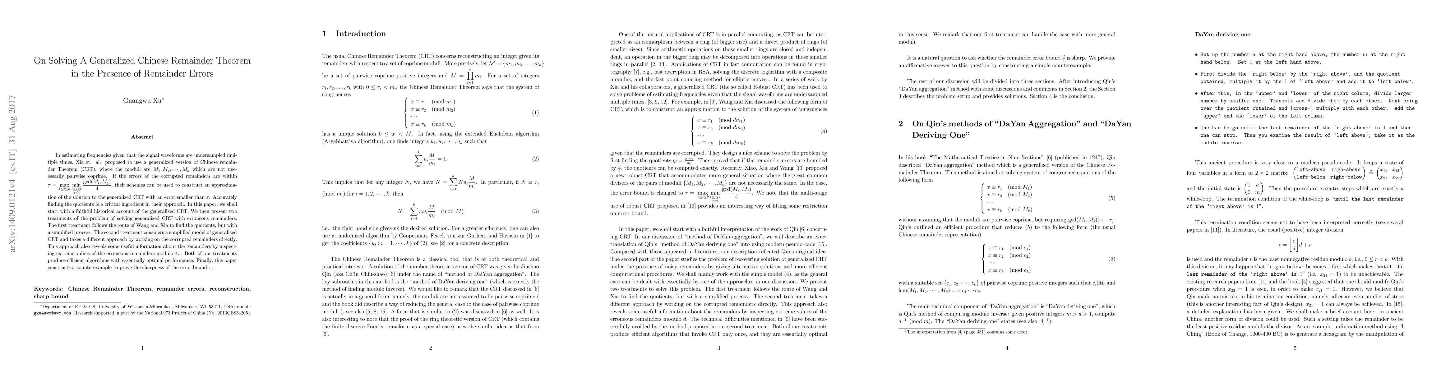 In estimating frequencies given that the signal waveforms are undersampled multiple times, Xia et. al. proposed to use a generalized version of Chinese remainder Theorem (CRT), where the moduli are $M_1, M_2, \cdots, M_k$ which are not necessarily pairwise coprime. If the errors of the corrupted remainders are within $\tau=\sds \max_{1\le i\le k} \min_{\stackrel{1\le j\le k}{j\neq i}} \frac{\gcd(M_i,M_j)}4$, their schemes can be used to construct an approximation of the solution to the generalized CRT with an error smaller than $\tau$. Accurately finding the quotients is a critical ingredient in their approach. In this paper, we shall start with a faithful historical account of the generalized CRT. We then present two treatments of the problem of solving generalized CRT with erroneous remainders. The first treatment follows the route of Wang and Xia to find the quotients, but with a simplified process. The second treatment considers a simplified model of generalized CRT and takes a different approach by working on the corrupted remainders directly. This approach also reveals some useful information about the remainders by inspecting extreme values of the erroneous remainders modulo $4\tau$. Both of our treatments produce efficient algorithms with essentially optimal performance. Finally, this paper constructs a counterexample to prove the sharpness of the error bound $\tau$.
