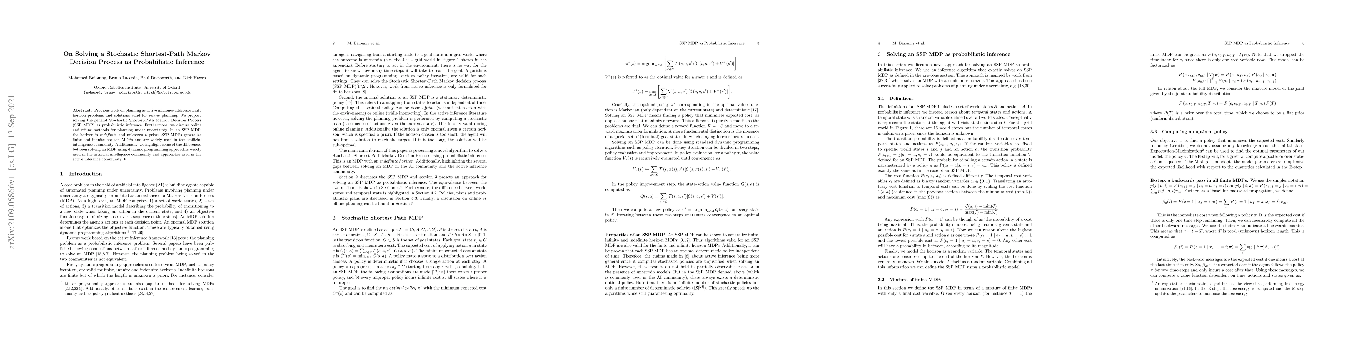 This paper proposes solving the Stochastic Shortest-Path Markov Decision Process (SSP MDP) as probabilistic inference, addressing indefinite and unknown horizons. It contrasts dynamic programming methods with active inference approaches for planning under uncertainty, discussing both online and offline planning strategies.