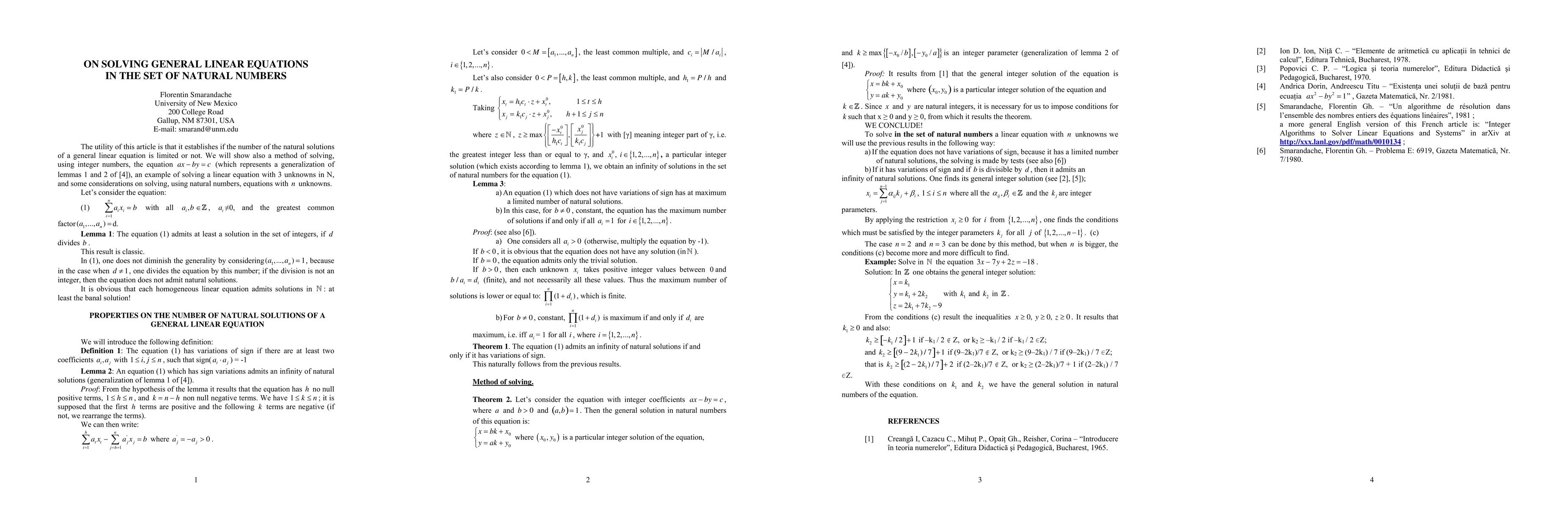 This paper investigates whether general linear equations in natural numbers have limited solutions and presents a method for solving Diophantine equations with three variables.
