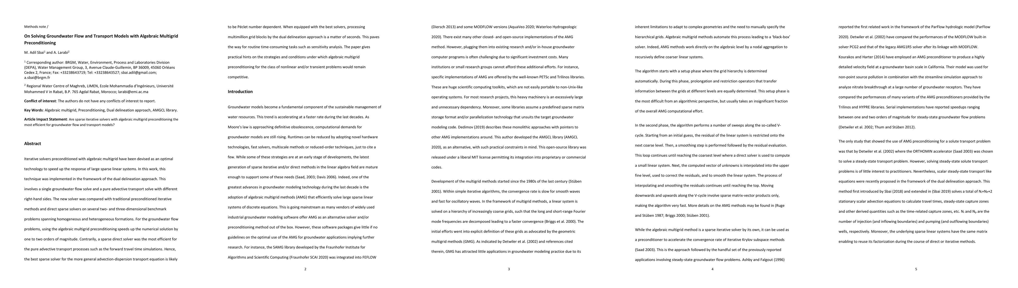 This paper explores the use of algebraic multigrid preconditioning to accelerate iterative solvers for groundwater flow and transport models, achieving significant speedups for flow problems but finding that direct solvers are more efficient for pure advection. The dual delineation approach enables rapid processing of large-scale simulations, facilitating routine sensitivity analysis.