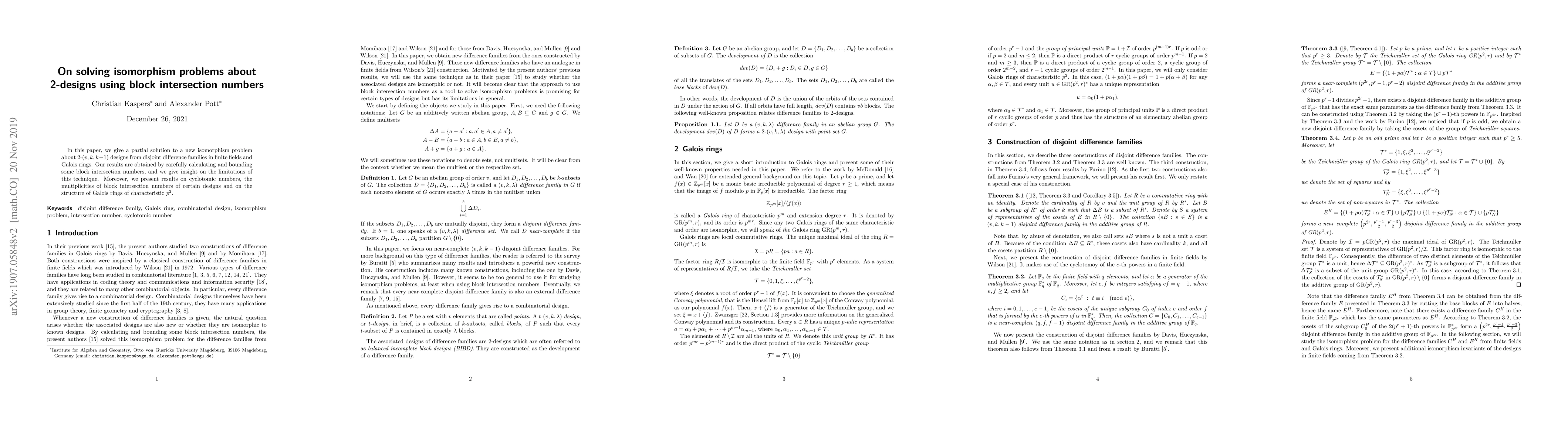 In this paper, we give a partial solution to a new isomorphism problem about $2$-$(v,k,k-1)$ designs from disjoint difference families in finite fields and Galois rings. Our results are obtained by carefully calculating and bounding some block intersection numbers, and we give insight on the limitations of this technique. Moreover, we present results on cyclotomic numbers and on the structure of Galois rings of characteristic $p^2$.