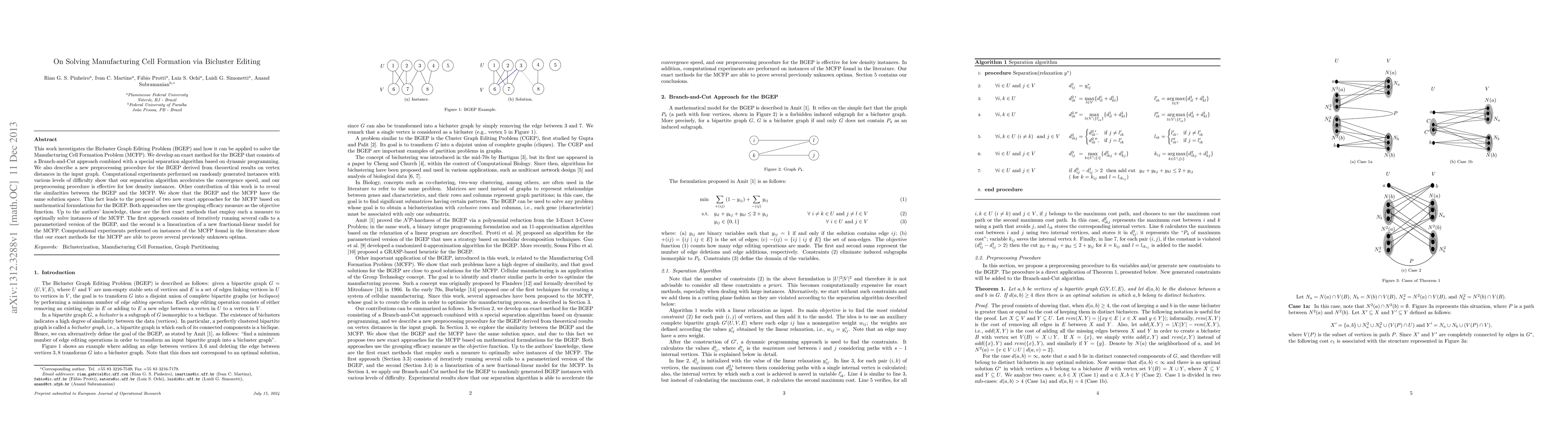 This work investigates the Bicluster Graph Editing Problem (BGEP) and how it can be applied to solve the Manufacturing Cell Formation Problem (MCFP). We develop an exact method for the BGEP that consists of a Branch-and-Cut approach combined with a special separation algorithm based on dynamic programming. We also describe a new preprocessing procedure for the BGEP derived from theoretical results on vertex distances in the input graph. Computational experiments performed on randomly generated instances with various levels of difficulty show that our separation algorithm accelerates the convergence speed, and our preprocessing procedure is effective for low density instances. Other contribution of this work is to reveal the similarities between the BGEP and the MCFP. We show that the BGEP and the MCFP have the same solution space. This fact leads to the proposal of two new exact approaches for the MCFP based on mathematical formulations for the BGEP. Both approaches use the grouping efficacy measure as the objective function. Up to the authors' knowledge, these are the first exact methods that employ such a measure to optimally solve instances of the MCFP. The first approach consists of iteratively running several calls to a parameterized version of the BGEP, and the second is a linearization of a new fractional-linear model for the MCFP. Computational experiments performed on instances of the MCFP found in the literature show that our exact methods for the MCFP are able to prove several previously unknown optima.