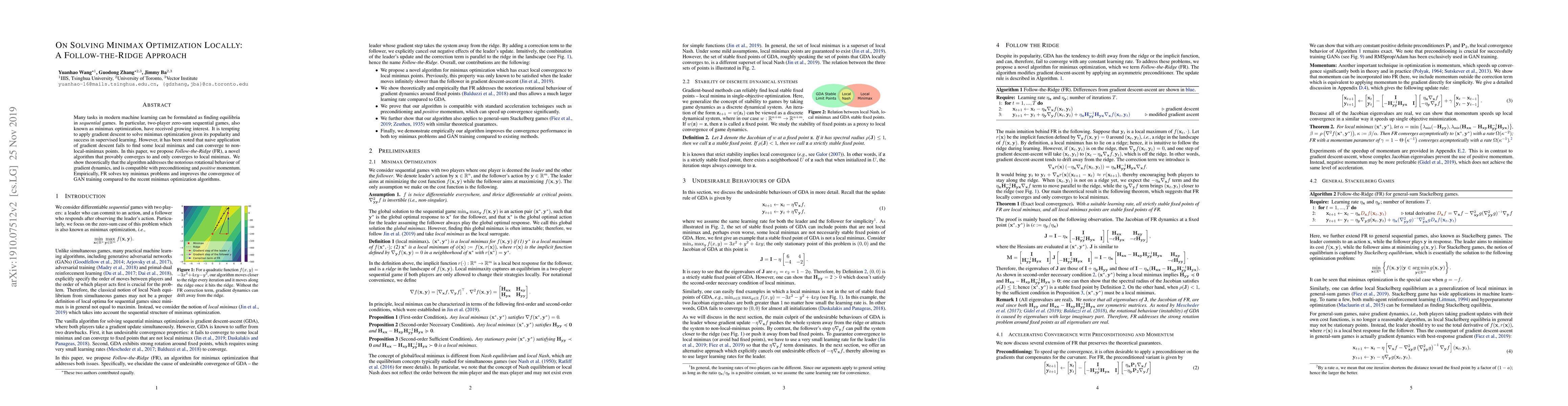 This paper introduces the Follow-the-Ridge (FR) algorithm to solve minimax optimization problems, addressing the failure of gradient descent to find local equilibria. FR is shown to converge to local minimax points and improves convergence in GAN training, demonstrating its effectiveness in handling the rotational behavior of gradient dynamics.