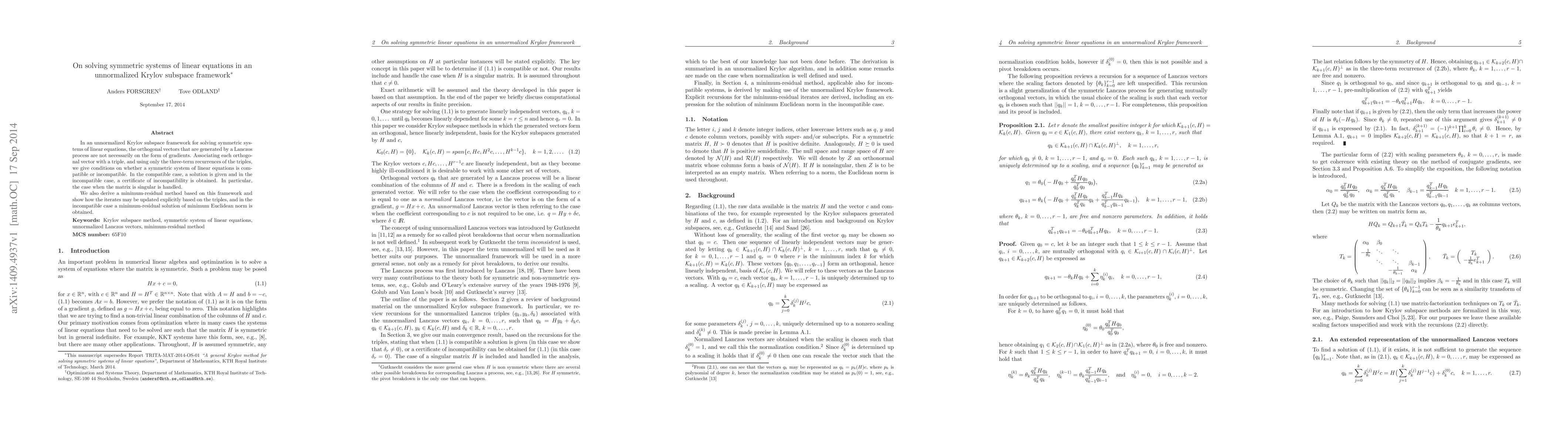 In an unnormalized Krylov subspace framework for solving symmetric systems of linear equations, the orthogonal vectors that are generated by a Lanczos process are not necessarily on the form of gradients. Associating each orthogonal vector with a triple, and using only the three-term recurrences of the triples, we give conditions on whether a symmetric system of linear equations is compatible or incompatible. In the compatible case, a solution is given and in the incompatible case, a certificate of incompatibility is obtained. In particular, the case when the matrix is singular is handled. We also derive a minimum-residual method based on this framework and show how the iterates may be updated explicitly based on the triples, and in the incompatible case a minimum-residual solution of minimum Euclidean norm is obtained.