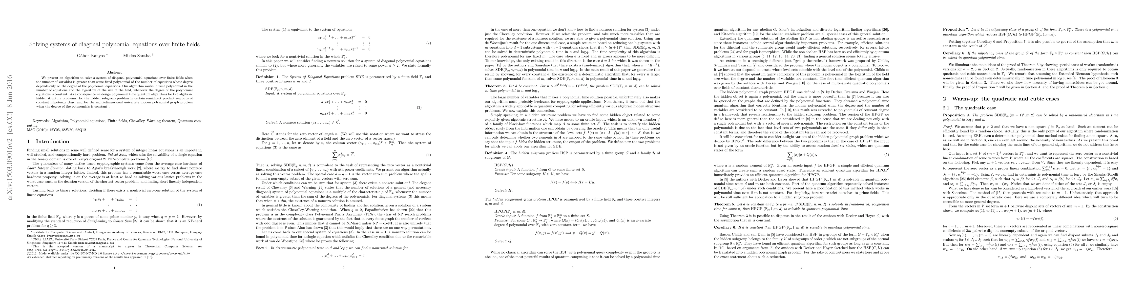This paper introduces an efficient algorithm for solving systems of diagonal polynomial equations over finite fields, achieving polynomial time complexity under certain conditions. The algorithm also leads to polynomial time quantum solutions for specific algebraic hidden structure problems.