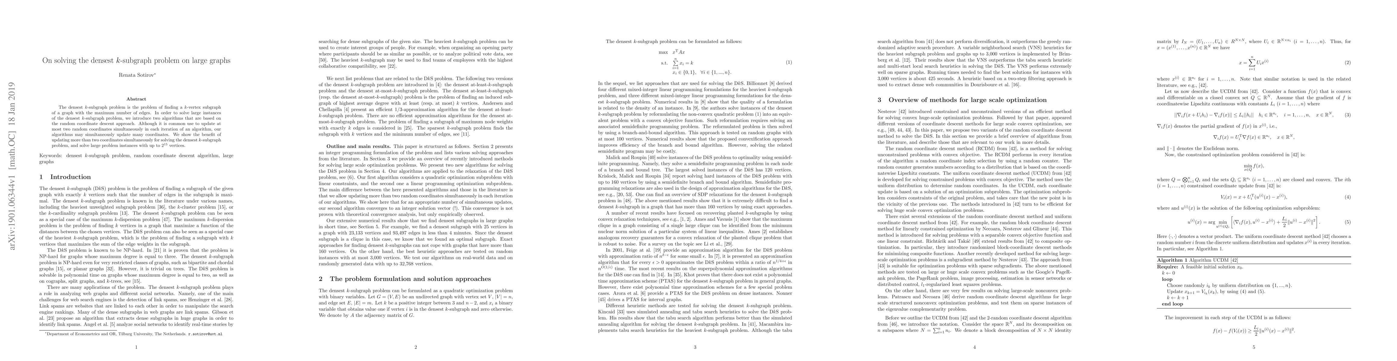 The densest $k$-subgraph problem is the problem of finding a $k$-vertex subgraph of a graph with the maximum number of edges. In order to solve large instances of the densest $k$-subgraph problem, we introduce two algorithms that are based on the random coordinate descent approach. Although it is common use to update at most two random coordinates simultaneously in each iteration of an algorithm, our algorithms may simultaneously update many coordinates. We show the benefit of updating more than two coordinates simultaneously for solving the densest $k$-subgraph problem, and solve large problem instances with up to $2^{15}$ vertices.