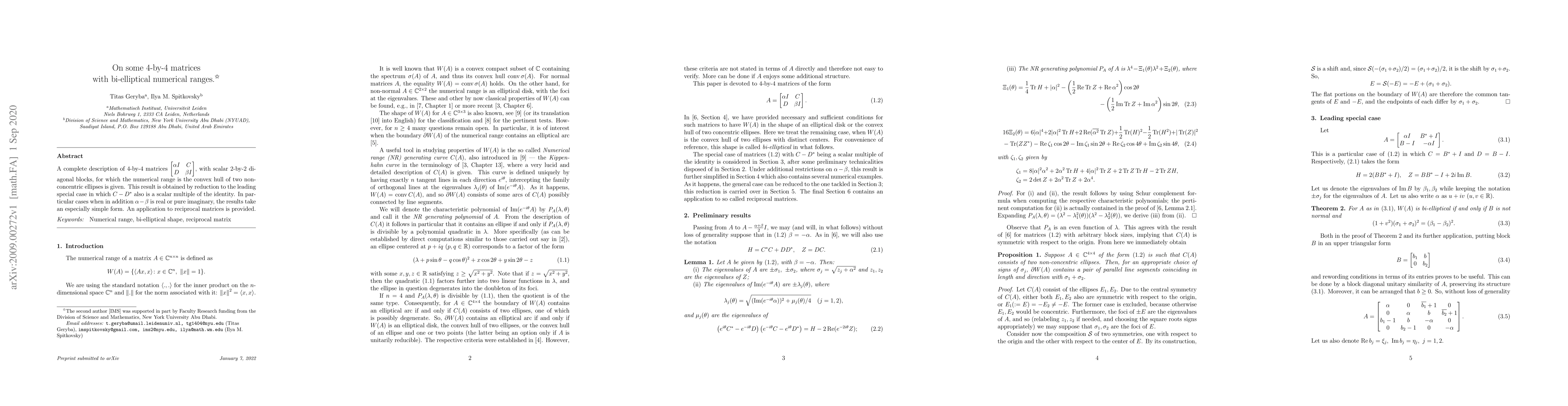 A complete description of 4-by-4 matrices $\begin{bmatrix}\alpha I & C \\D & \beta I\end{bmatrix}$, with scalar 2-by-2 diagonal blocks, for which the numerical range is the convex hull of two non-concentric ellipses is given. This result is obtained by reduction to the leading special case in which $C-D^*$ also is a scalar multiple of the identity. In particular cases when in addition $\alpha-\beta$ is real or pure imaginary, the results take an especially simple form. An application to reciprocal matrices is provided.