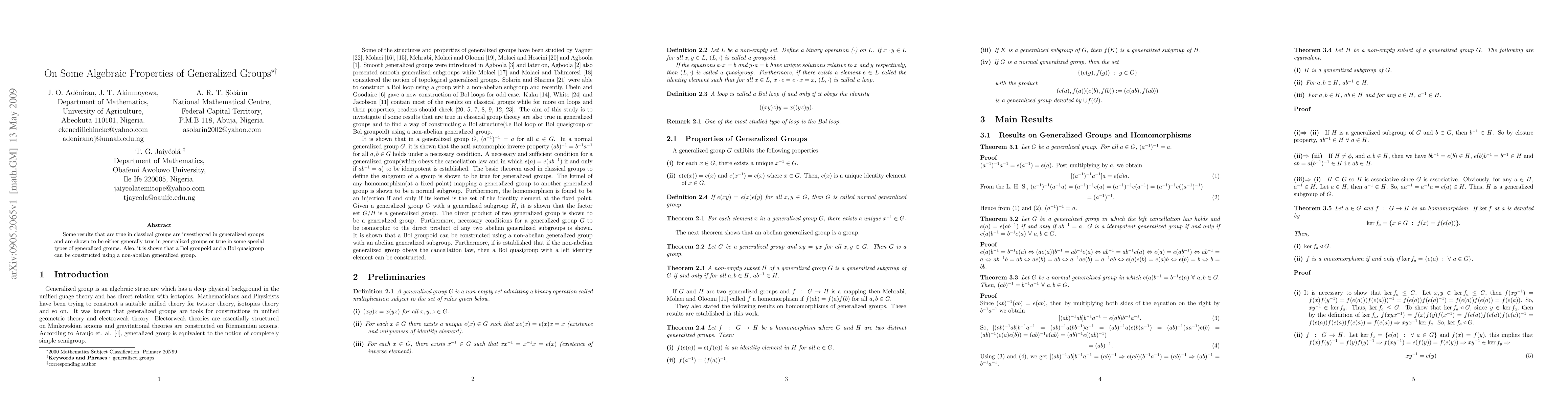 Researchers explored algebraic properties of generalized groups, finding that some results from classical groups hold true in generalized groups or specific subtypes, while also demonstrating the construction of Bol groupoids and quasigroups from non-abelian generalized groups.