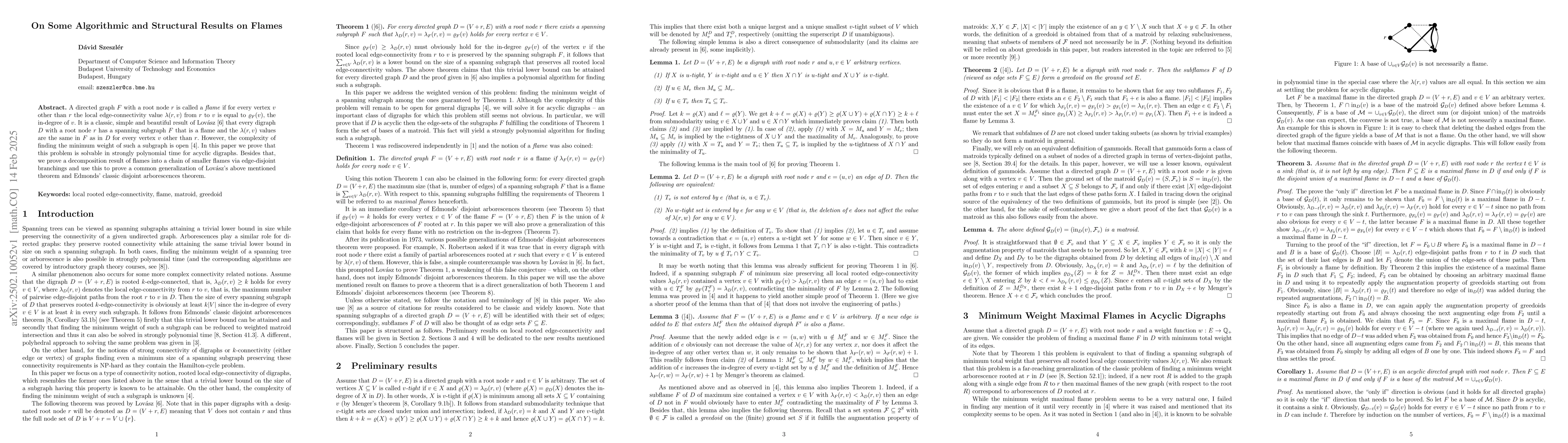 The work combines structural results on flames with algorithmic techniques, offering a novel perspective on the relationship between flames, matroids, and disjoint arborescences, generalizing known theorems in the process.