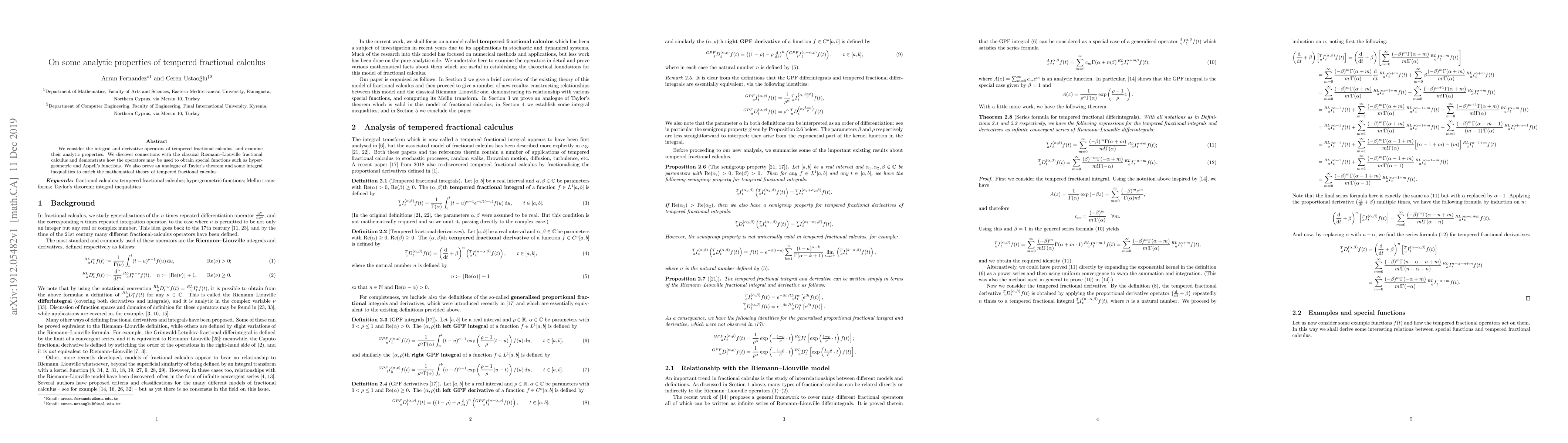 We consider the integral and derivative operators of tempered fractional calculus, and examine their analytic properties. We discover connections with the classical Riemann-Liouville fractional calculus and demonstrate how the operators may be used to obtain special functions such as hypergeometric and Appell's functions. We also prove an analogue of Taylor's theorem and some integral inequalities to enrich the mathematical theory of tempered fractional calculus.