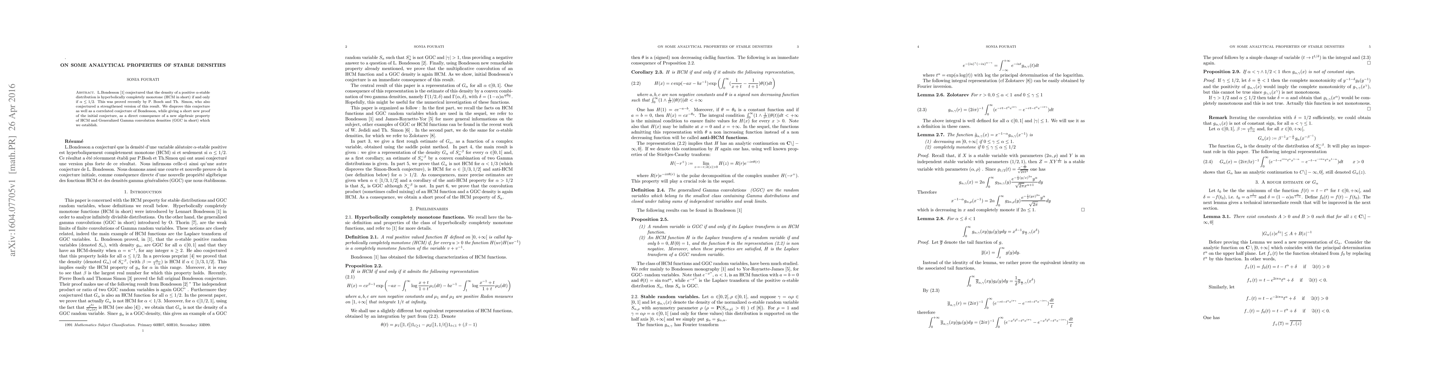 L.Bondesson [1] conjectured that the density of a positive $\alpha$-stable distribution is hyperbolically completely monotone (HCM in short) if and only if $\alpha$ $\le$ 1/2. This was proved recently by P. Bosch and Th. Simon, who also conjectured a strengthened version of this result. We disprove this conjecture as well as a correlated conjecture of Bondesson, while giving a short new proof of the initial conjecture, as a direct consequence of a new algebraic property of HCM and Generalized Gamma convolution densities (GGC in short) which we establish.