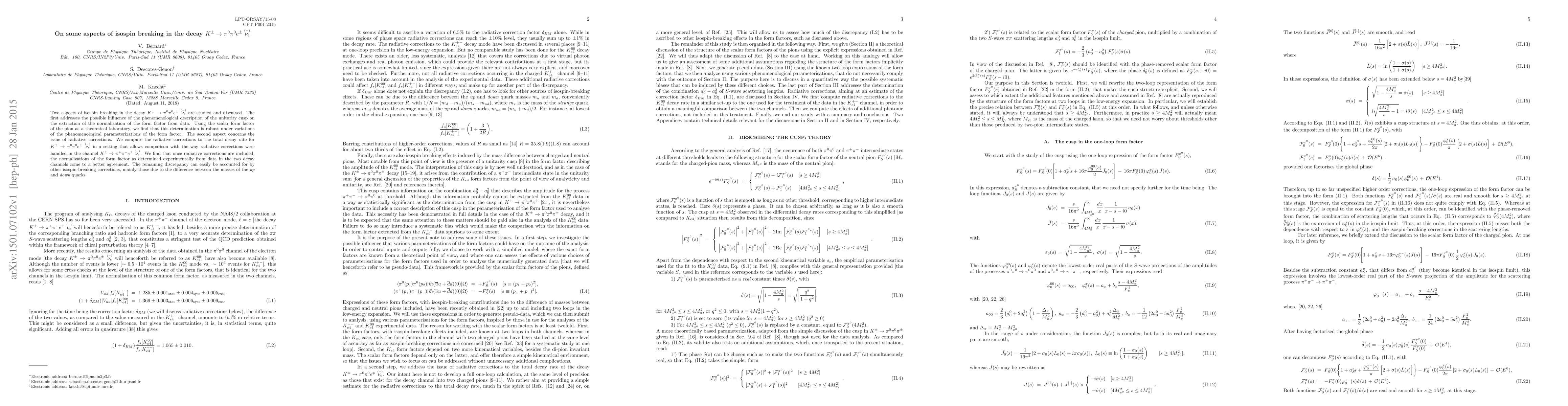 This paper investigates isospin breaking in the decay $K^\pm \to \pi^0 \pi^0 e^\pm \stackrel{_{(-)}}{\nu_e}$, focusing on the impact of the unitarity cusp and radiative corrections. It finds that the normalization of the form factor is robust against variations in its phenomenological description, and that including radiative corrections improves agreement between the decay channels.