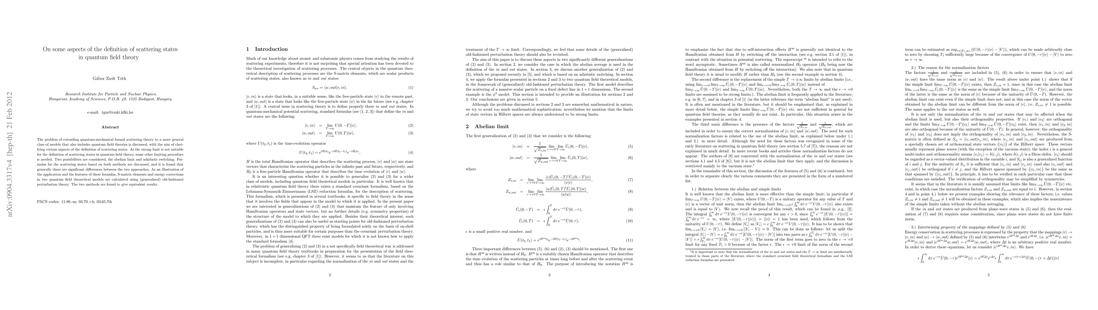 This paper explores extending quantum-mechanical scattering theory to quantum field theory, proposing the abelian limit and adiabatic switching as alternatives to the unsuitable strong limit for defining scattering states. Both methods yield distinct formulas, yet they provide equivalent results in calculations of S-matrix elements and energy corrections in specific models.
