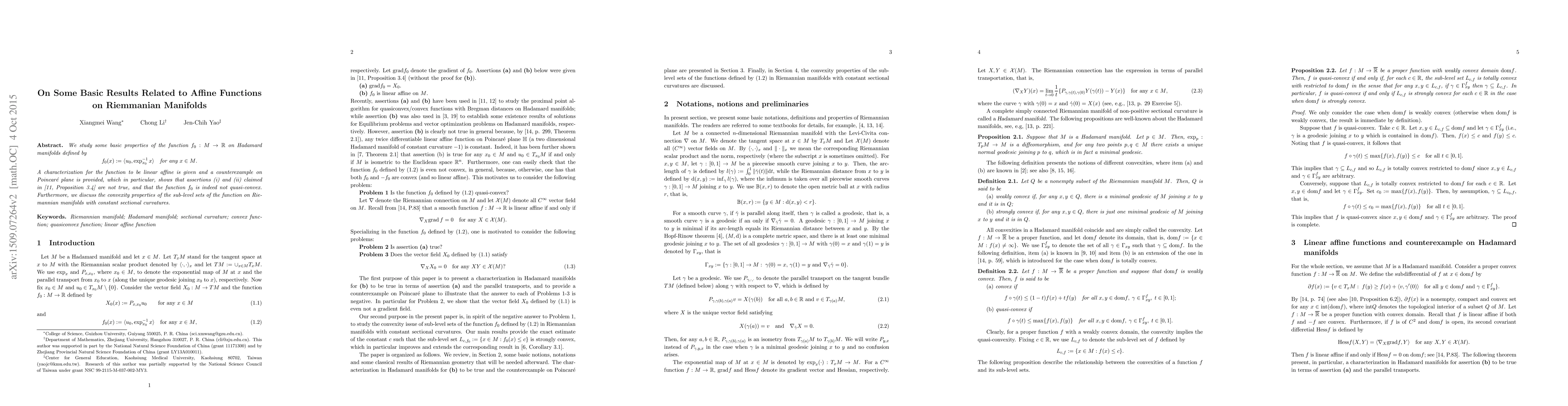 We study some basic properties of the function $f_0:M\rightarrow\IR$ on Hadamard manifolds defined by $$ f_0(x):=\langle u_0,\exp_{x_0}^{-1}x\rangle\quad\mbox{for any $x\in M$}. $$ A characterization for the function to be linear affine is given and a counterexample on Poincar\'e plane is provided, which in particular, shows that assertions (i) and (ii) claimed in \cite[Proposition 3.4]{Papa2009} are not true, and that the function $f_0$ is indeed not quasi-convex. Furthermore, we discuss the convexity properties of the sub-level sets of the function on Riemannian manifolds with constant sectional curvatures.