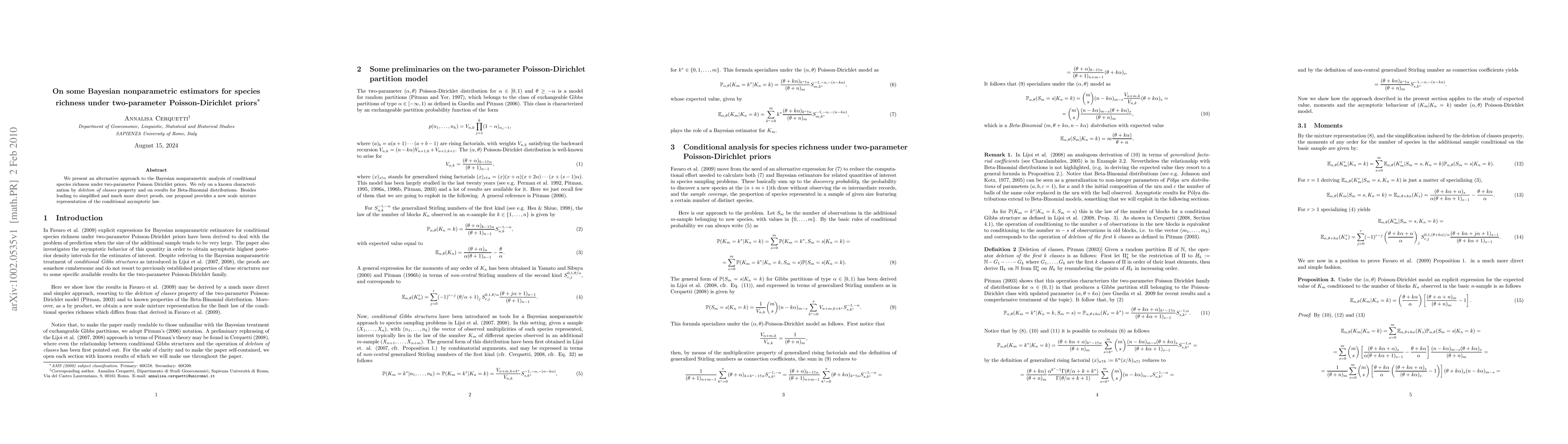 This paper introduces a novel Bayesian nonparametric method for estimating species richness using two-parameter Poisson-Dirichlet priors, leveraging a deletion of classes property and Beta-Binomial distribution results for simplified proofs and a new scale mixture representation of the conditional asymptotic law.