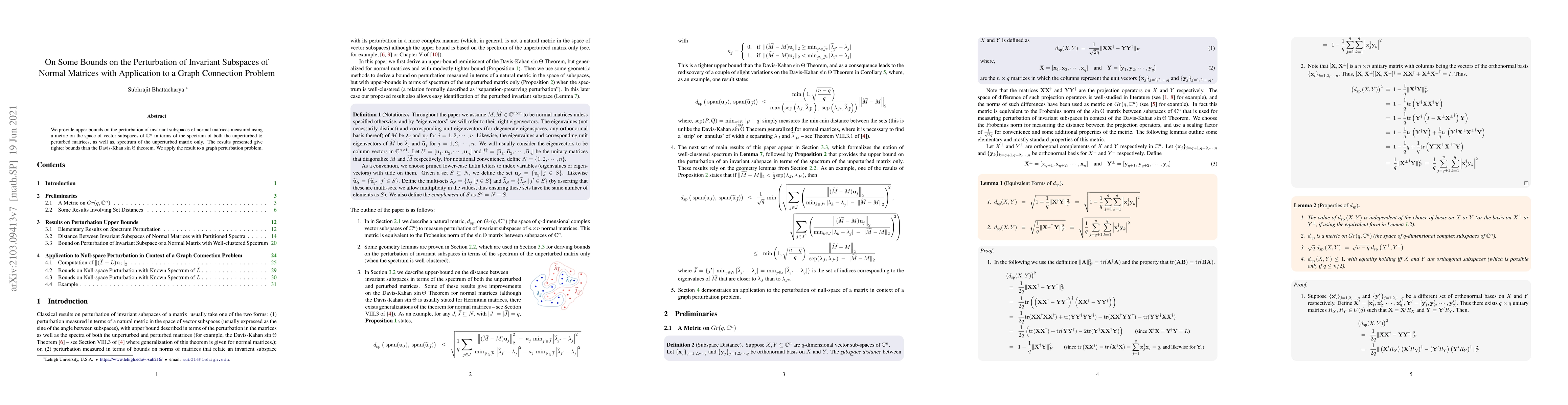 We provide upper bounds on the perturbation of invariant subspaces of normal matrices measured using a metric on the space of vector subspaces of $\mathbb{C}^n$ in terms of the spectrum of both the unperturbed \& perturbed matrices, as well as, spectrum of the unperturbed matrix only. The results presented give tighter bounds than the Davis-Khan $\sin\Theta$ theorem. We apply the result to a graph perturbation problem.