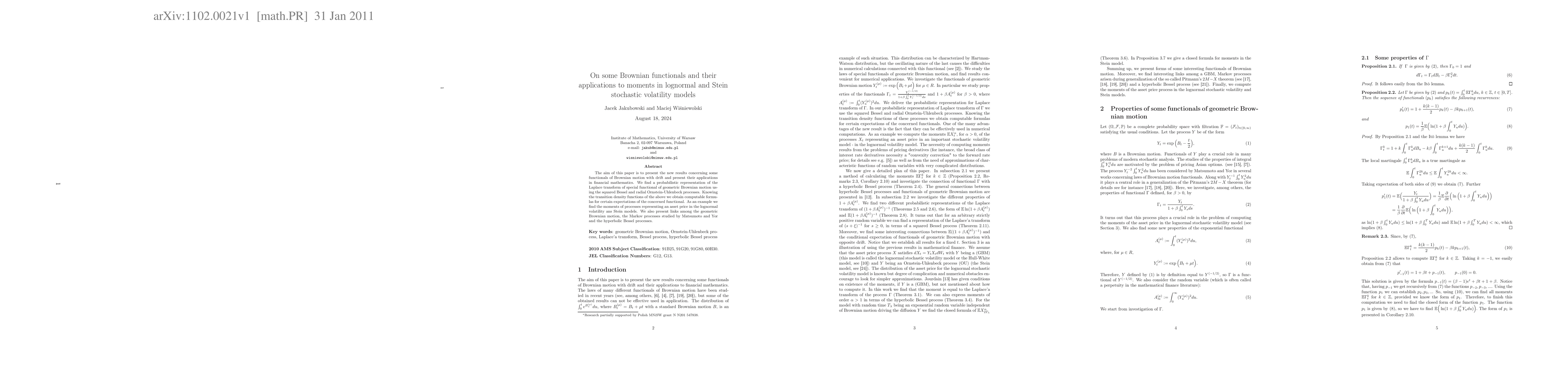 This paper introduces new results on Brownian functionals with drift and their applications in financial mathematics, specifically in lognormal and Stein stochastic volatility models. It provides probabilistic representations and computable formulas for expectations of these functionals, linking them to geometric Brownian motion and related Markov processes.