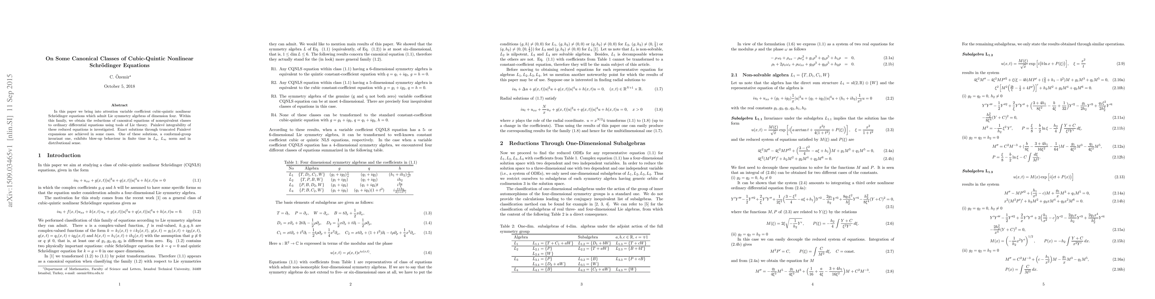 In this paper we bring into attention variable coefficient cubic-quintic nonlinear Schr\"odinger equations which admit Lie symmetry algebras of dimension four. Within this family, we obtain the reductions of canonical equations of nonequivalent classes to ordinary differential equations using tools of Lie theory. Painlev\'e integrability of these reduced equations is investigated. Exact solutions through truncated Painlev\'e expansions are achieved in some cases. One of these solutions, a conformal-group invariant one, exhibits blow-up behaviour in finite time in $L_p$, $L_\infty$ norm and in distributional sense.