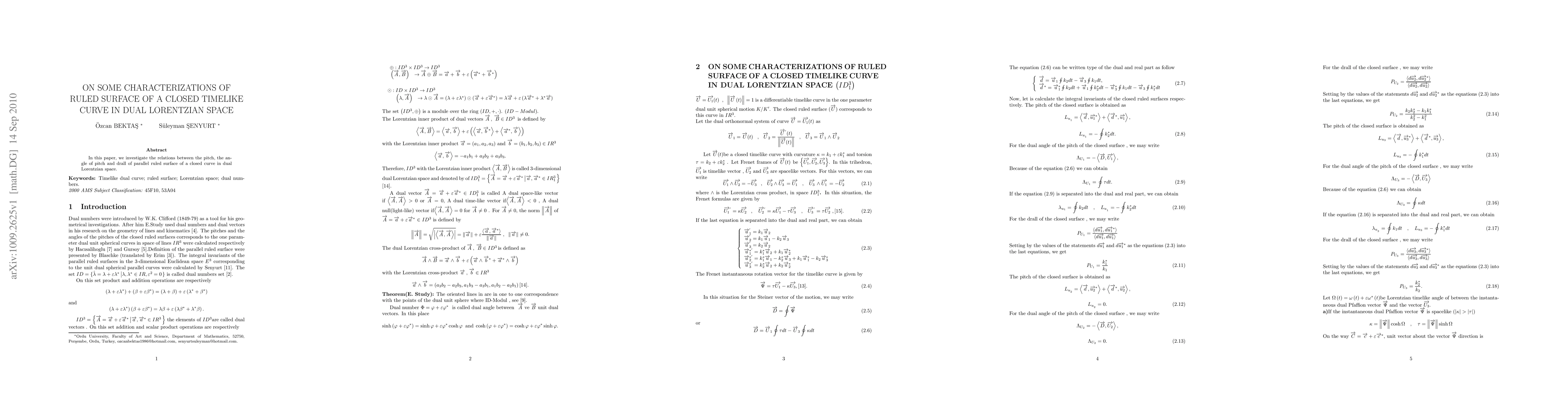 In this paper, we investigate the relations between the pitch, the angle of pitch and drall of parallel ruled surface of a closed curve in dual Lorentzian space.