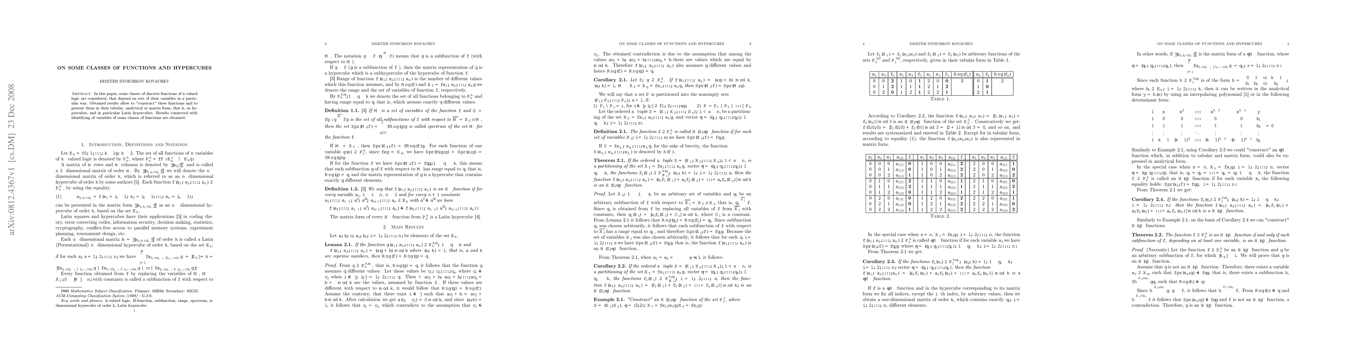 In this paper, some classes of discrete functions of $k$-valued logic are considered, that depend on sets of their variables in a particular way. Obtained results allow to "construct" these functions and to present them in their tabular, analytical or matrix form, that is, as hypercubes, and in particular Latin hypercubes. Results connected with identifying of variables of some classes of functions are obtained.