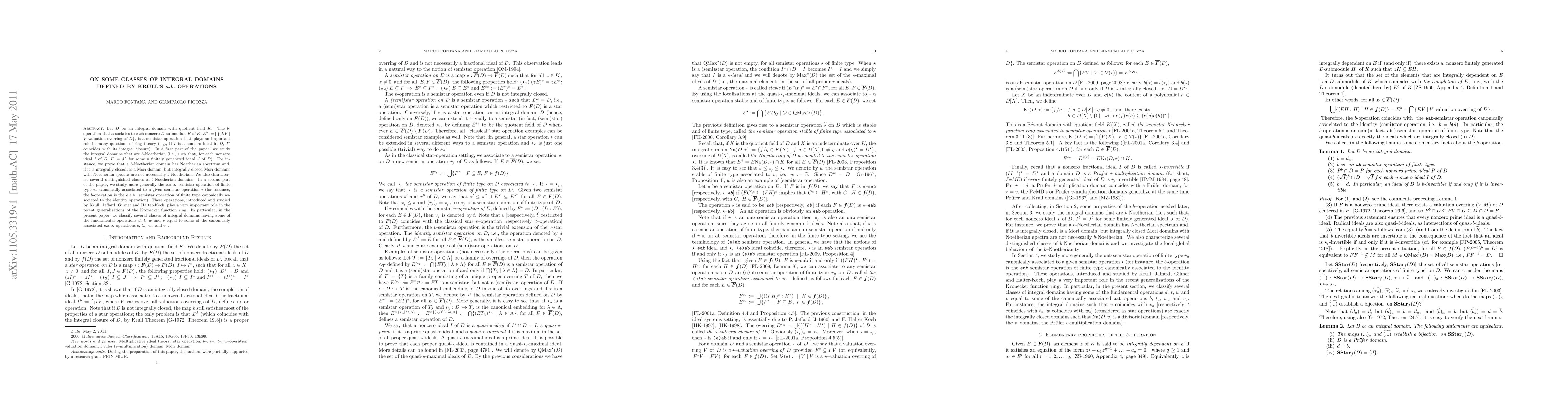 This paper investigates integral domains defined by Krull's $a.b.$ operations, focusing on $b$-Noetherian domains and their properties. It characterizes $b$-Noetherian domains and their connections to Mori domains, and explores the e.a.b. semistar operations of finite type associated with various canonical operations.