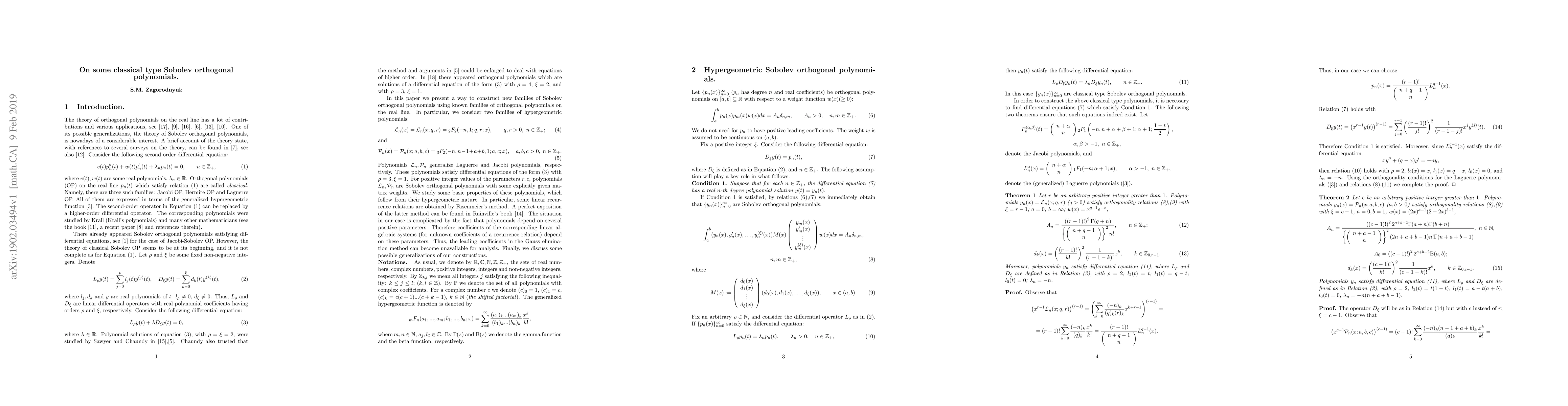 This paper constructs classical type Sobolev orthogonal polynomials using two families of hypergeometric polynomials that generalize Laguerre and Jacobi polynomials. These polynomials satisfy higher-order differential equations and are shown to be Sobolev orthogonal for specific parameter values, with basic properties and recurrence relations also derived.