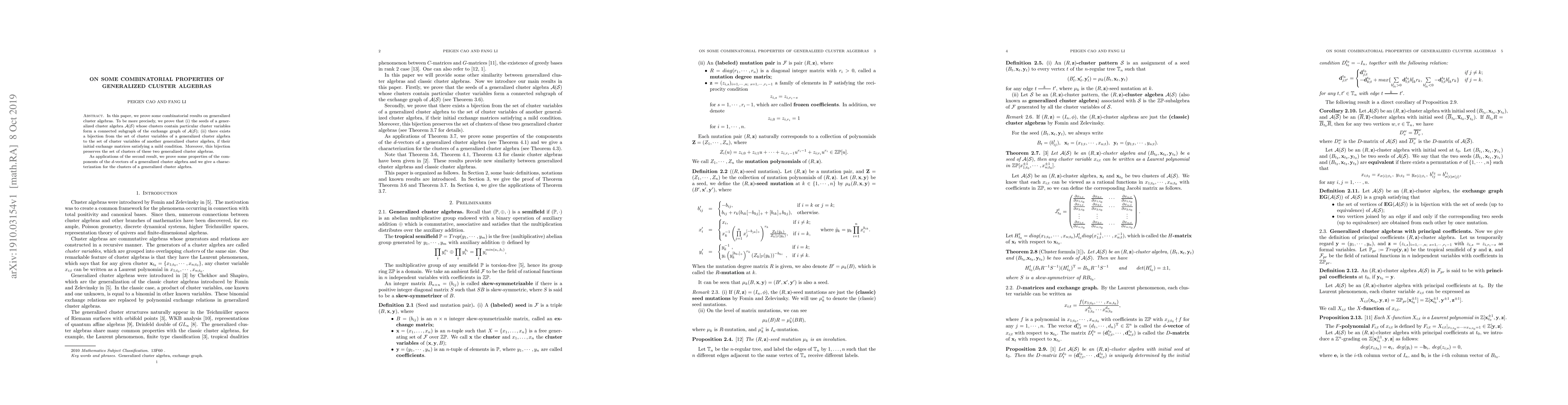 The paper proves combinatorial results on generalized cluster algebras using properties of seeds, exchange graphs, and cluster variables, alongside a bijection between cluster variables of two generalized cluster algebras under a mild condition.